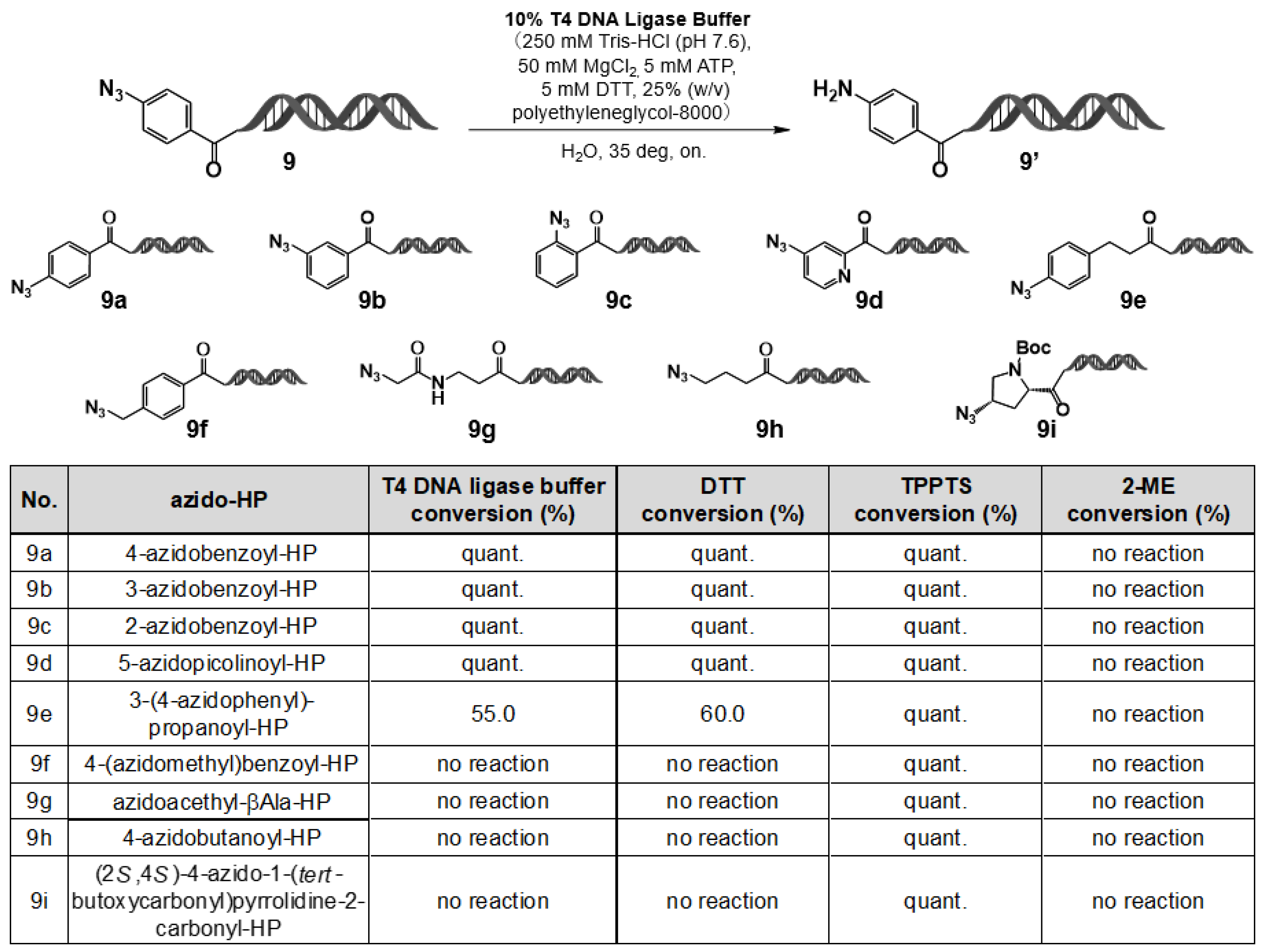 Figure 6. Comparison of T4 DNA ligase buffer, DTT, TPPTS, and 2–ME for the reduction of azido-HP substrates (9a9i). Azido–HPs 9a9i were reduced under T4 ligase buffer, DTT, TPPTS, or 2–ME. LC/MS conversion values are shown; quant. = >95%.