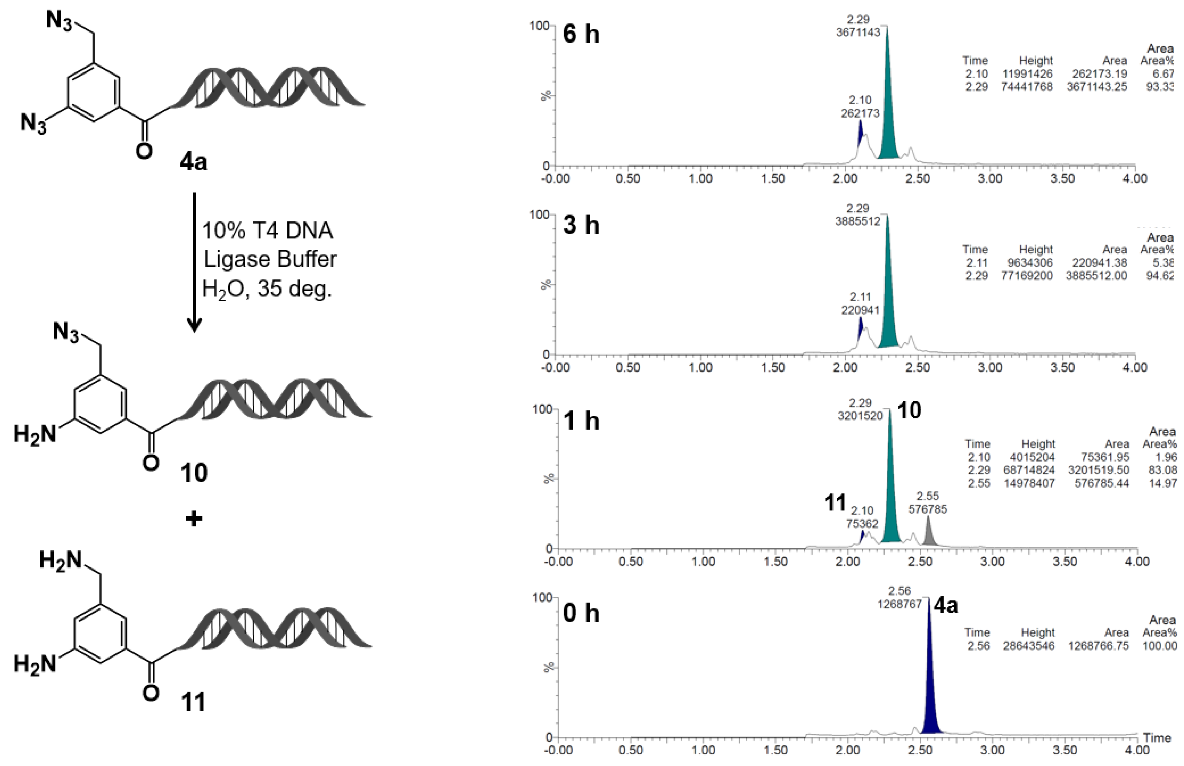 Figure 7. Reduction kinetics of on–DNA diazide 4a in T4 DNA ligase buffer at 35 deg: formation of monoamine 10 and diamine 11. On–DNA diazide 4a was incubated in 10% T4 DNA ligase buffer (Tris–HCl pH 7.6, MgCl2, ATP, DTT, PEG–8000) in UltraPure distilled water at 35 deg. Reaction progress was monitored by LC/MS at 0, 1, 3, and 6 h. The parent diazide 4a decreased over time, with formation of monoamine 10 and diamine 11. Chromatograms show relative peak areas at each time point.