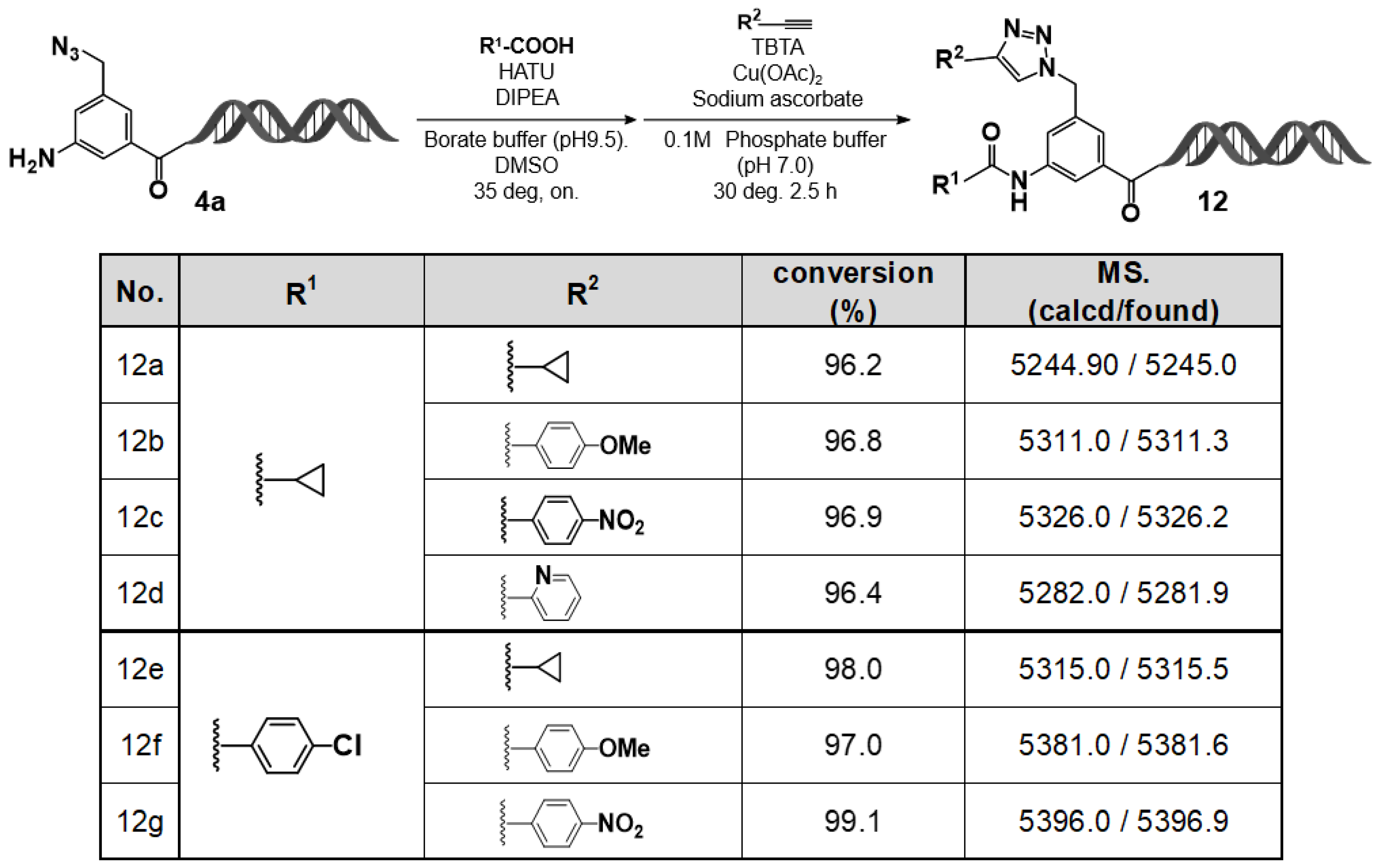 Figure 8. Two-step diversification of on–DNA amino intermediate via HATU–mediated amidation and CuAAC: substrate scope and LC/MS analysis (12a12g). On–DNA amidation followed by CuAAC produced 12a12g with high conversions. LC/MS verified the expected masses (calcd/found).