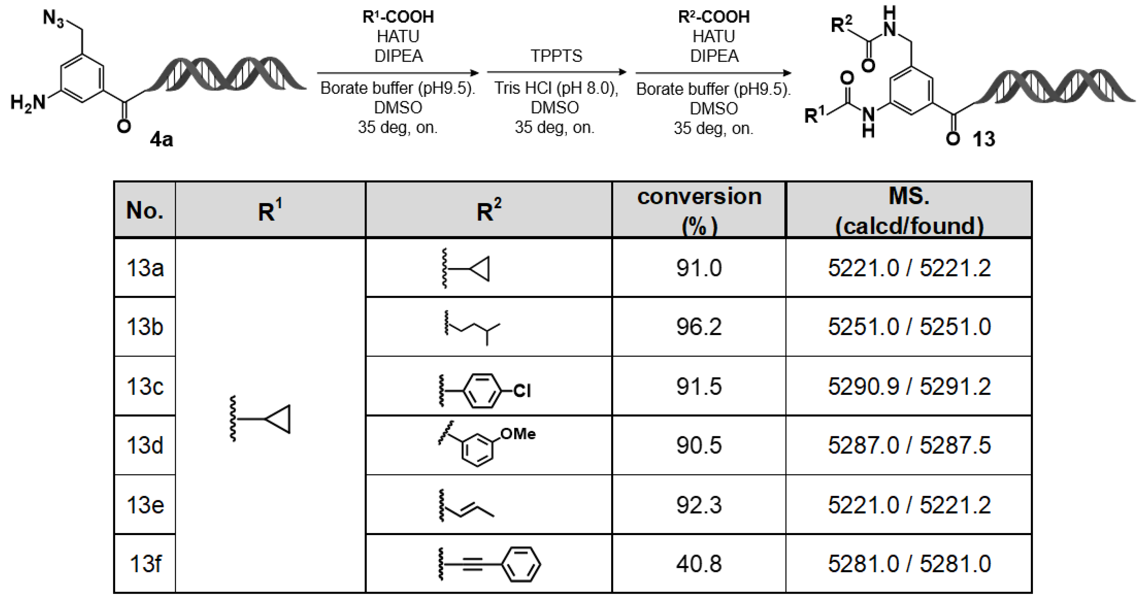 Figure 9. Sequential on–DNA amidation (R1–COOH) and TPPTS-assisted reduction followed by second amidation (R2–COOH): formation of bis-amide products 13a13f. Sequential amidation–TPPTS reduction–amidation-afforded products 13a13f. LC/MS showed high conversions and correct masses.