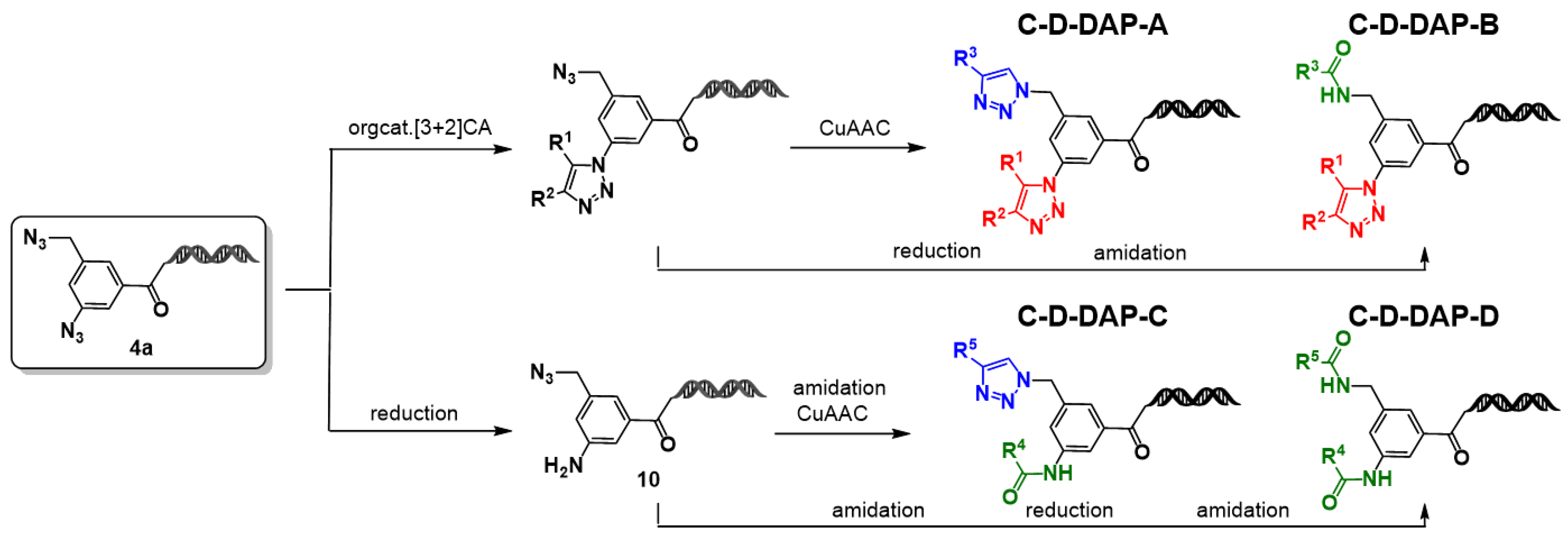 Figure 10. Synthetic routes to the C-D-DAP platform libraries (A–D). On–DNA diazide platform molecule was diversified via organocatalytic [3+2] cycloaddition, reduction, CuAAC, and amidation to generate four DEL–compatible sub–libraries. [3+2]CA reaction component (red), CuAAC reaction component (blue), amidation reaction component (green).
