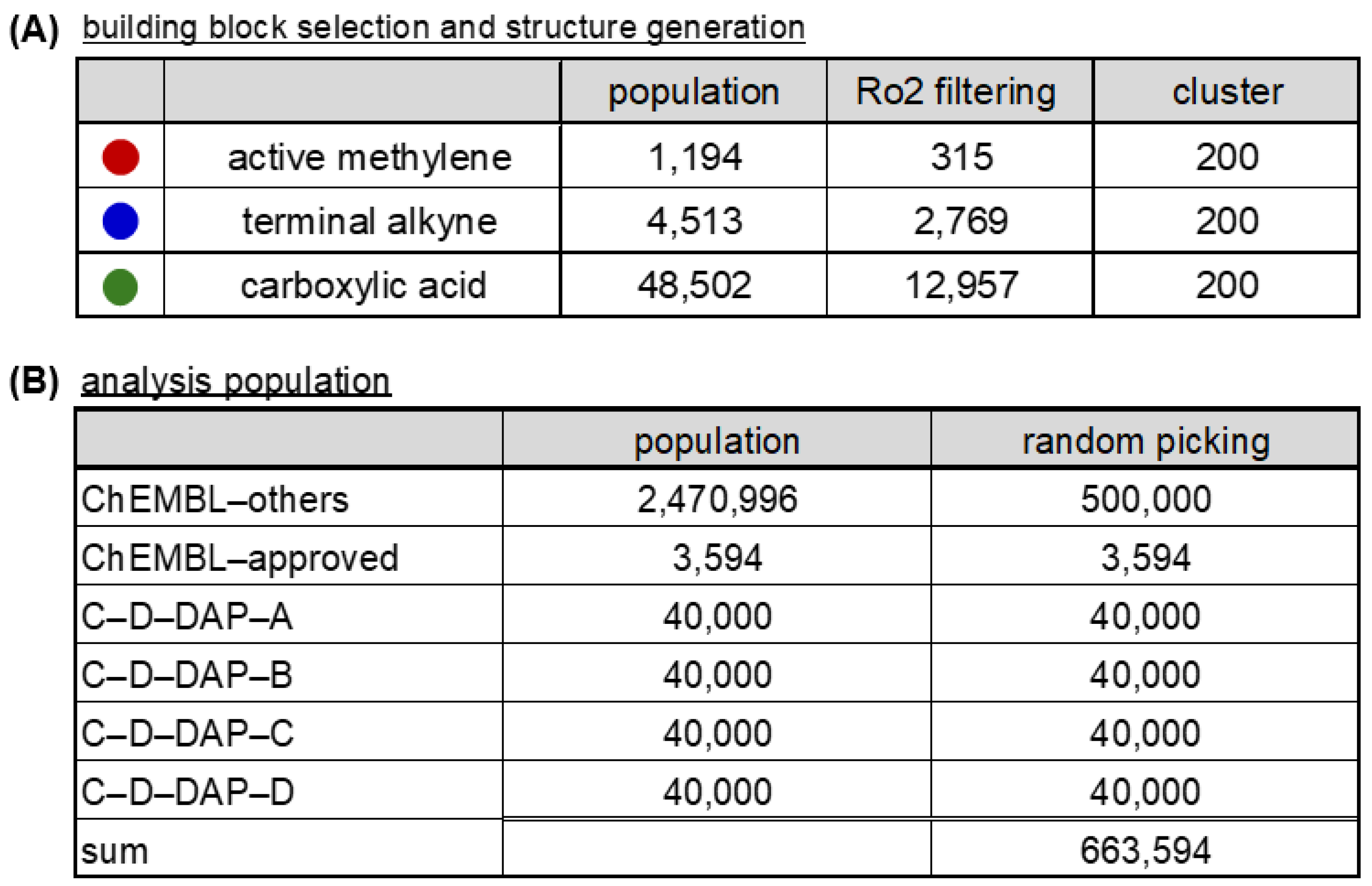 Figure 11. Summary of building block (BB) selection and population sampling for chemical space analysis (A) and Workflow for BB filtering and dataset construction for comparative chemical space analysis (B). (A) Three classes of commercially available BBs—active methylene, terminal alkyne, and carboxylic acid—were filtered by Ro2 and clustered (200 clusters each) to generate representative sets for virtual DEL construction. (B) For chemical space analysis, representative populations were prepared from ChEMBL (approved, investigated, and remaining compounds) and the four C–D–DAP libraries. Random sampling was applied where indicated.