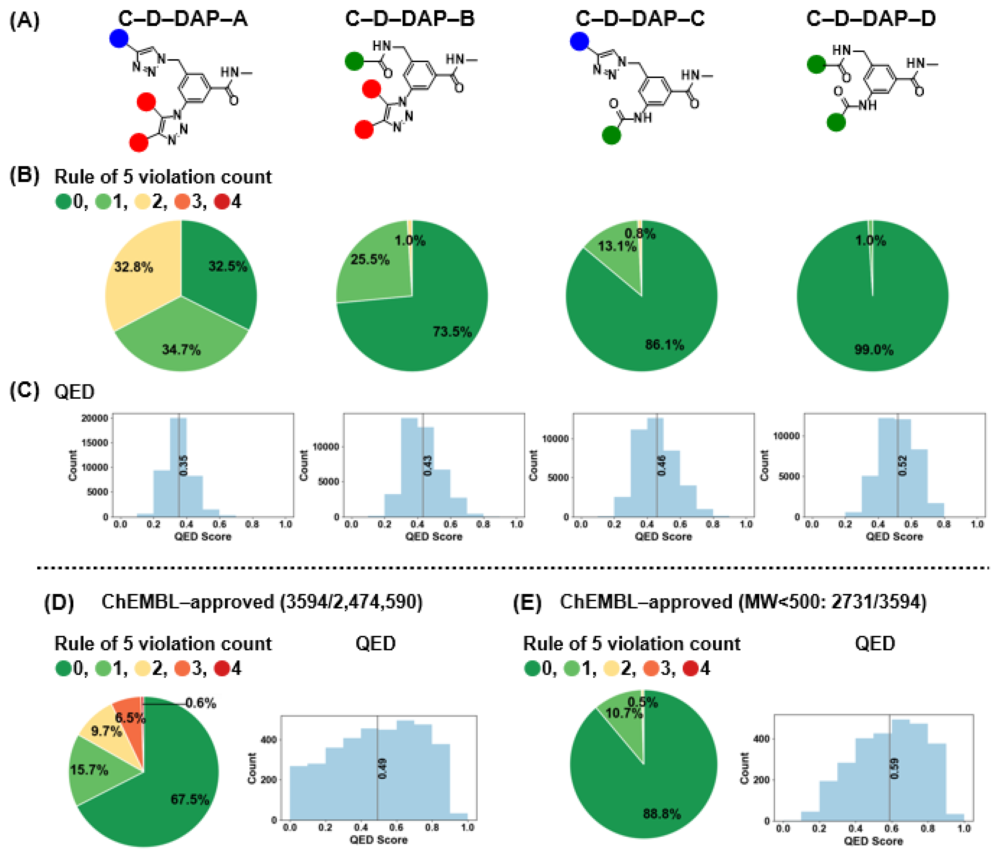 Figure 12. Drug–likeness assessment of the C–D–DAP libraries: rule–of–5 violation profiles and QED score distributions compared with ChEMBL–approved drugs. (A) Structures of the four virtual C–D–DAP libraries (AD). (B) Distribution of Lipinski’s rule of 5 (Ro5) violation counts across each library, showing the proportion of compounds with 0–4 violations. (C) Quantitative estimate of drug-likeness (QED) score distributions for each library. (D) Ro5 violation and QED distribution for all ChEMBL–approved compounds (n = 3594). (E) Same analyses applied to ChEMBL approved compounds with MW < 500 (n = 2731) for comparison with DEL-like space.