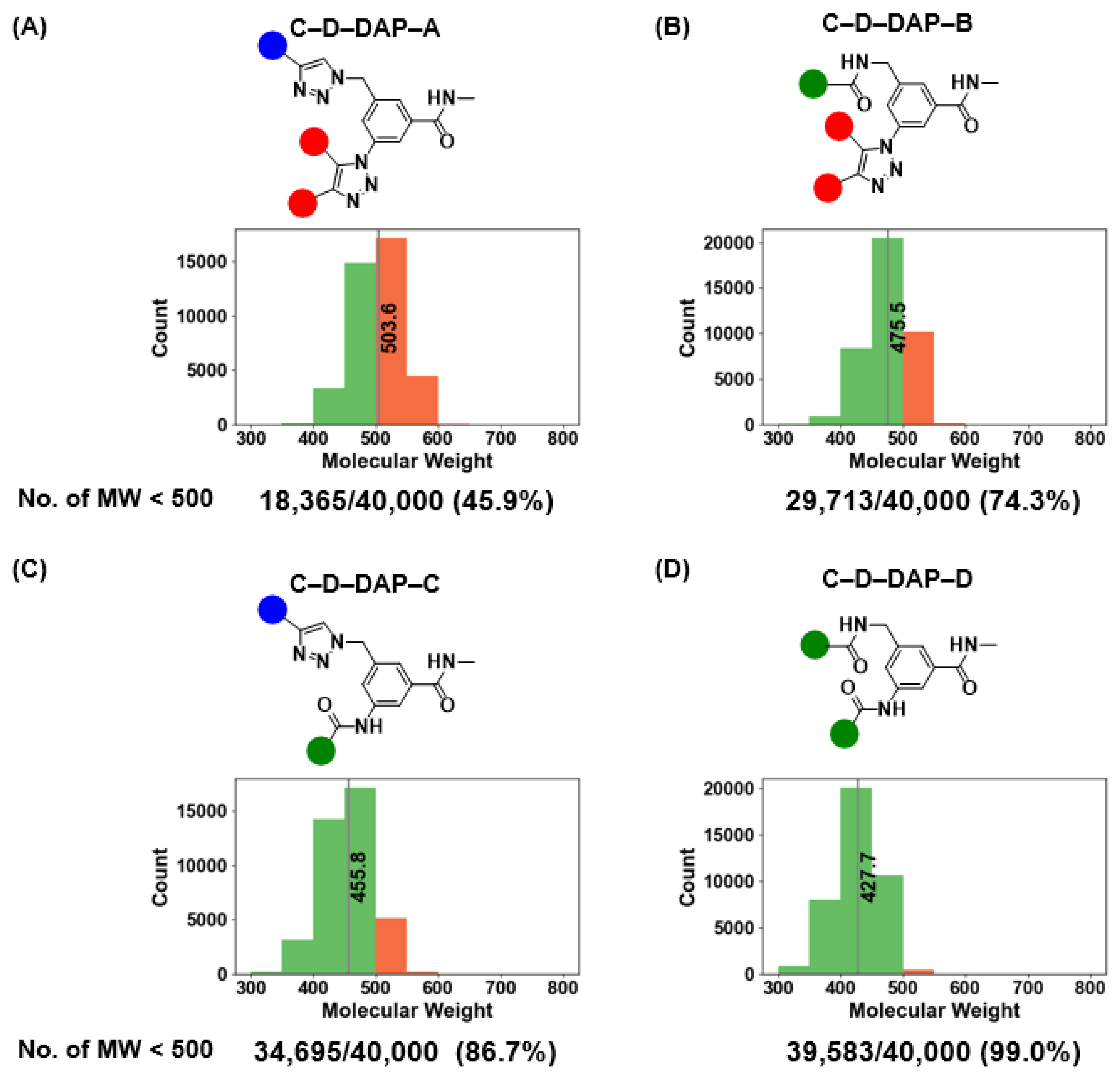 Figure 13. Molecular weight distributions of the C–D–DAP libraries (AD) and proportions of compounds with MW < 500. (AD) Histograms show molecular weight (MW) distributions for each C–D–DAP library (AD). The red bar indicates the mean MW for each library. The number and percentage of compounds with MW < 500 are shown below each plot (n = 40,000 per library). C–D–DAP–C and C–D–DAP–D exhibit particularly high fractions of MW < 500, aligning well with typical small-molecule drug-like space.