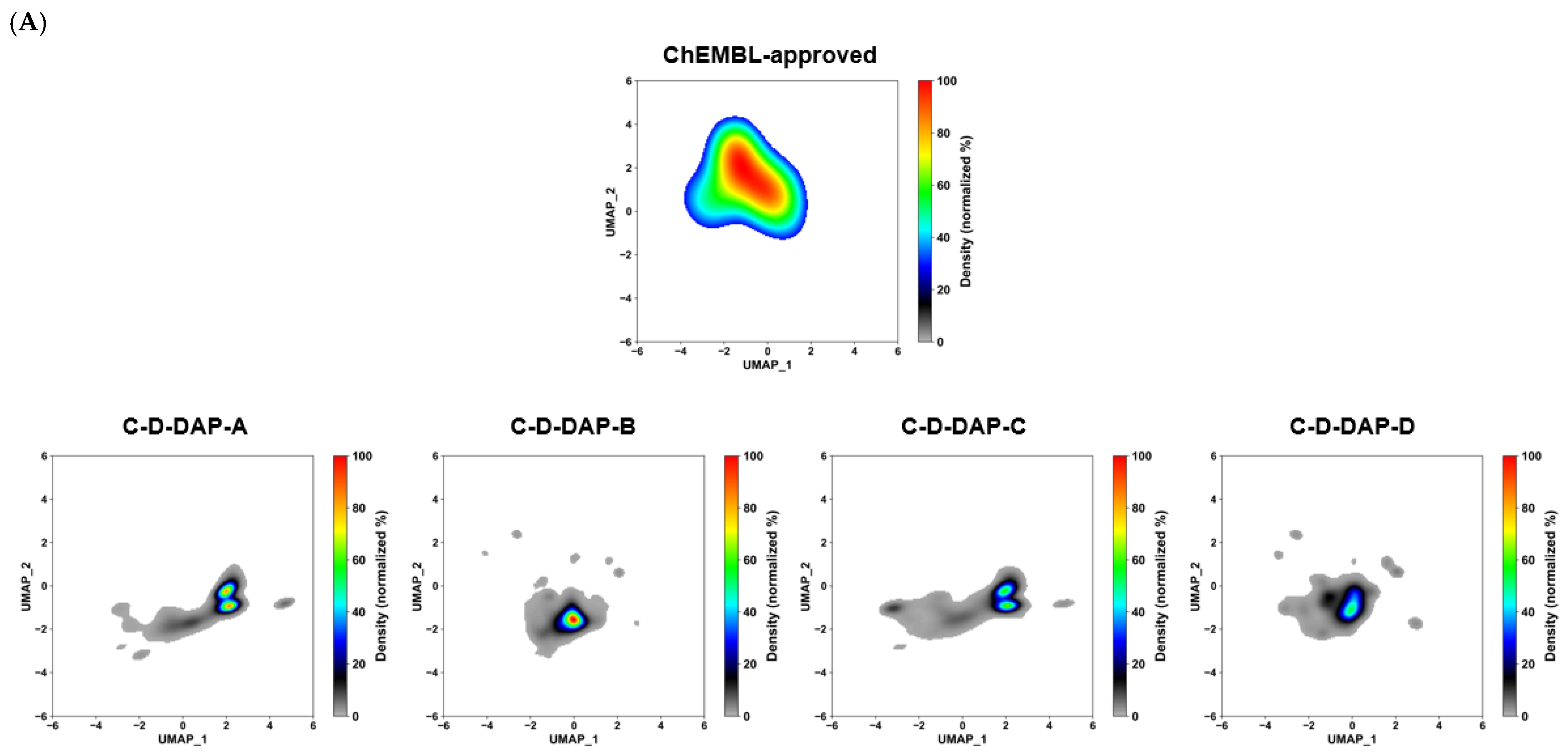 To evaluate this, a model of chemical space was constructed from 500,000 randomly selected compounds from ChEMBL version 35. Extended circular fingerprints (FCFP4; radius = 2, 1024 bits) were generated and projected onto two dimensions using uniform manifold approximation and projection [28] (UMAP; n_neighbors = 50, metric = “jaccard”). The trained model was applied to four C–D–DAP libraries (A–D; 40,000 compounds each) and to 3594 approved drugs in ChEMBL, enabling direct visualization of their distributions within a unified space.