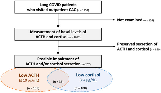 During the study period, 1251 patients with long COVID were eligible for preliminary screening. Random ACTH and/or cortisol levels were measured in 1097 patients based on clinical necessity. As a result, low random ACTH levels (≤10 pg/mL) were observed in 135 patients (12.3%), low random cortisol levels (<4 μg/dL) in 108 patients (9.8%), either finding in 207 patients (18.9%), and both findings in 36 patients (3.3%; Figure 1).