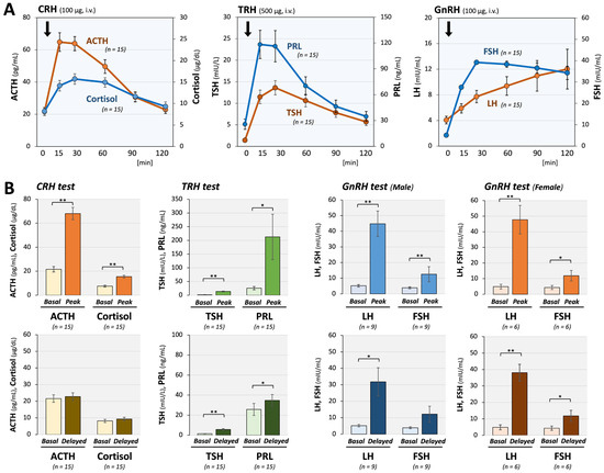 Pituitary responses to CRH, TRH, and GnRH stimulation in long COVID patients. (A) Time-dependent changes in pituitary hormones are shown. In 15 long COVID patients, anterior pituitary responses to stimulation with CRH (100 μg), TRH (500 μg), and GnRH (100 μg) were largely maintained; however, significant delays in peak responses, particularly for LH and FSH, were observed. These delay patterns suggest hypothalamic dysfunction rather than primary pituitary dysfunction. (B) Comparison of mean basal and peak hormone levels showed significant and substantial increases in all anterior pituitary hormones, supporting the conclusion that pituitary dysfunction is unlikely. In contrast, 120 min after stimulation, TSH, PRL, male LH, female LH, and female FSH significantly increased from baseline (1.4 vs. 5.7 mIU/L, 25.7 vs. 34.8 ng/mL, 5.2 vs. 31.8 mIU/mL, 4.9 vs. 38.1 mIU/mL, and 4.3 vs. 11.8 mIU/mL, respectively), demonstrating a prolonged response suggestive of hypothalamic dysfunction. The arrows indicate the time points of hormone injection. * p < 0.05 and ** p < 0.01 indicate significant differences between the indicated groups.