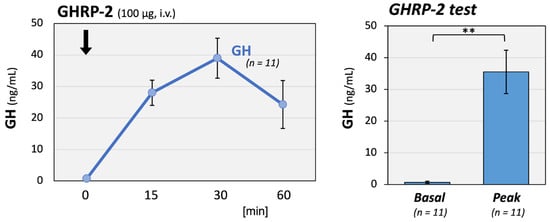 GH responses to GHRP-2 stimulation in long COVID patients. GH responses to GHRP-2 (100 μg) stimulation were well maintained in 11 long COVID patients. The left panel shows the time course of serum GH concentrations, and the right panel shows the basal and peak GH levels after stimulation. The mean GH peak level reached 35.5 ng/mL, a significant increase from baseline. The arrow indicates the time point of hormone injection. ** p < 0.01 indicates a significant difference between the indicated groups.
