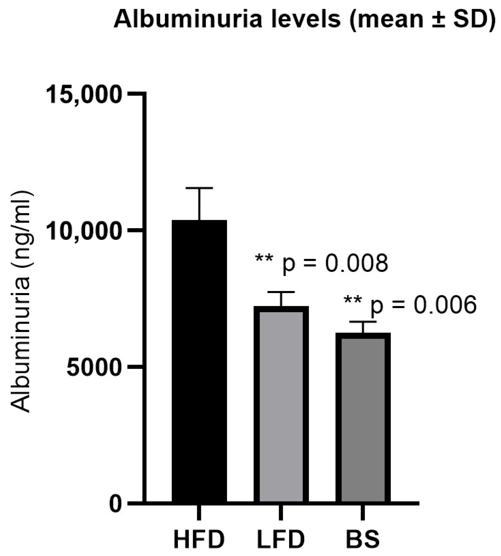 2.1. Effects of Low-Fat Diet and Bariatric Surgery on Body Weight and Albuminuria in Wistar Rats