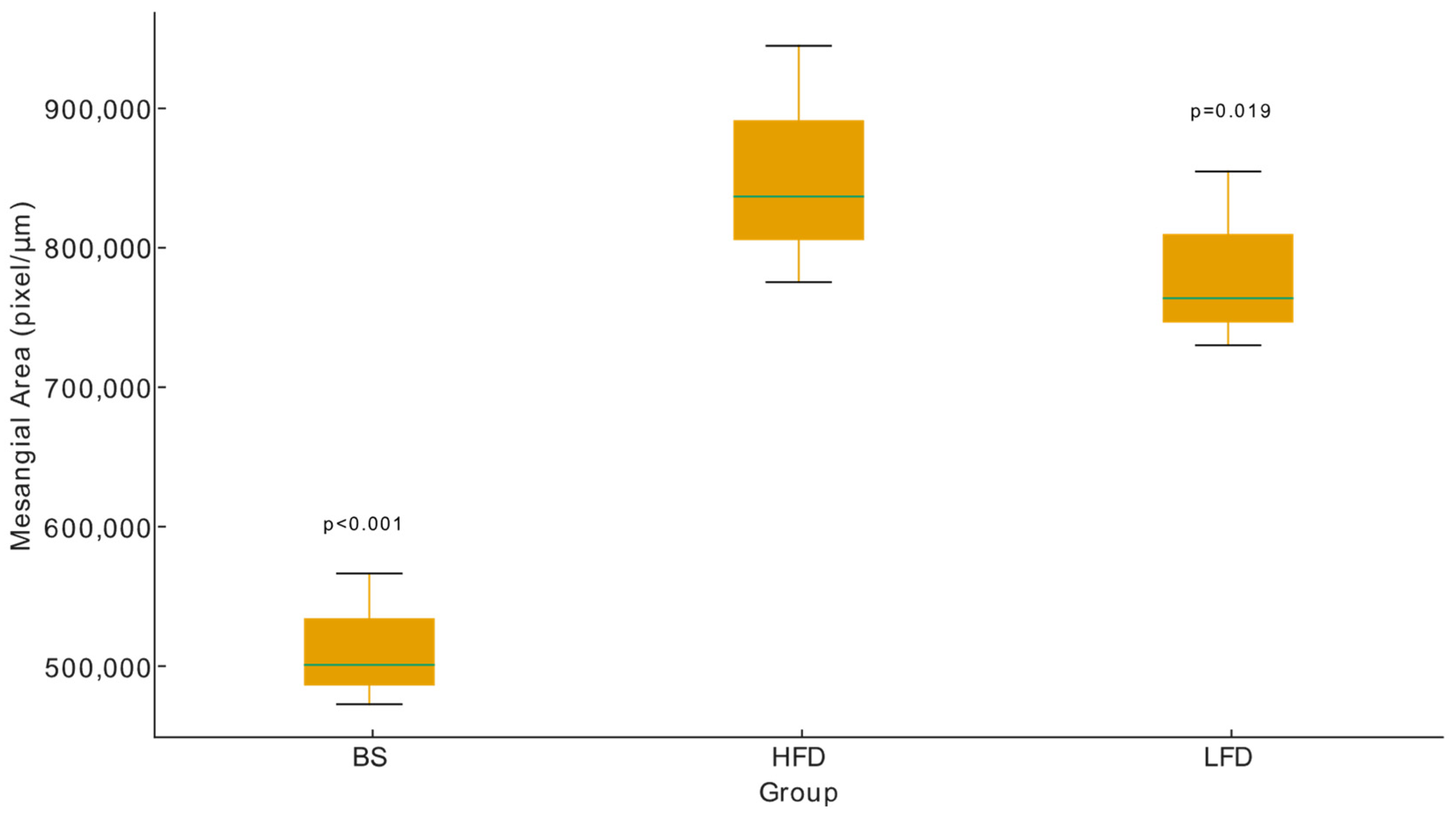 2.2. Study of Renal Morphological Changes in LFD and BS Rats