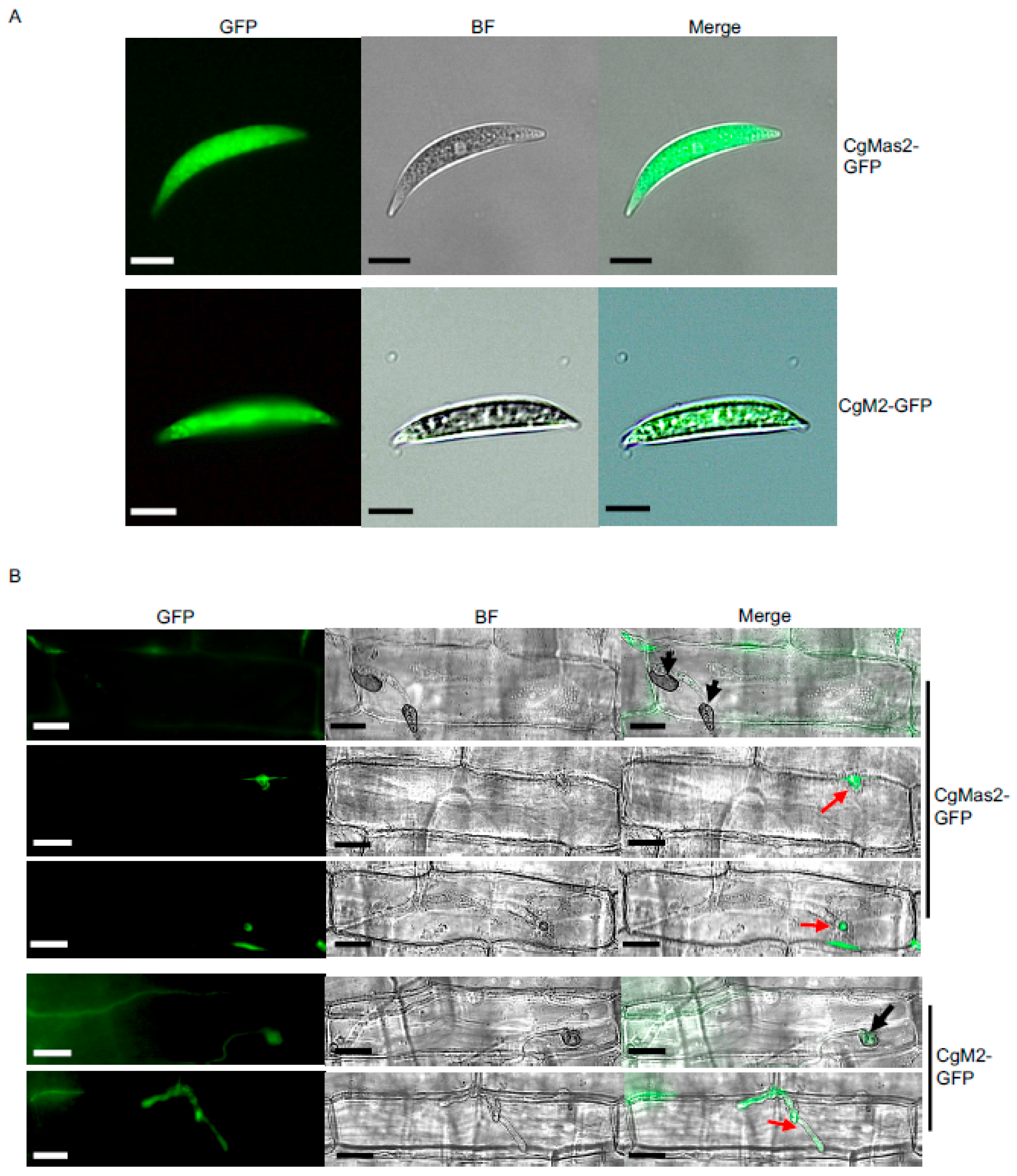 2.4. CgMas2 Localizes to the Conidia Cytoplasm and Initial Segment of the Primary Invasive Hyphae
