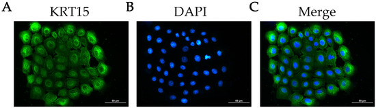 Identification of cultured SHFSCs in vitro. (A) Immunofluorescence staining for KRT15 (green). (B) Nuclear staining with DAPI (blue). (C) Merged image. Scale bar: 50 μm.