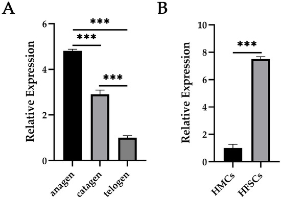 Total RNA was extracted from secondary HFSCs using RNAiso (Takara, Beijing, China). cDNA was synthesized from the extracted RNA using PrimeScript™ RT (Takara, Dalian, China), following the manufacturer’s recommended protocol. Quantitative real-time PCR (RT-qPCR) was performed with SYBR Premix Ex Taq II (Takara, Dalian, China). Relative mRNA expression levels of target genes were calculated using the 2−ΔΔCt method, with Gapdh serving as the internal reference control. Statistical analyses were conducted using SPSS software (v.15.0). Data are presented as mean ± SD, and statistical significance was set at p < 0.05. The detailed sequences of the primers used in this study are provided in Table S2.