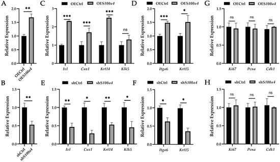 Unlike its clear effects on differentiation and pluripotency, S100a4 did not significantly influence HFSC proliferation. Neither overexpression nor silencing of S100a4 altered the expression of key proliferation markers, including Ki67, Pcna, and Cdk1 (Figure 3G,H).