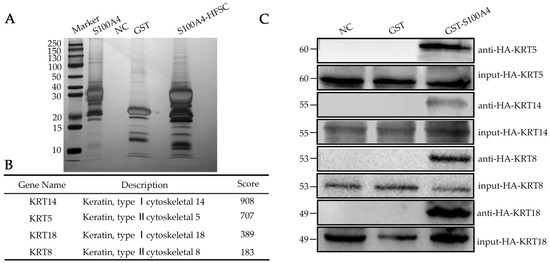 To elucidate the mechanistic basis of S100A4 function, we performed GST pull-down assays combined with LC–MS/MS to identify S100A4-interacting proteins in secondary HFSCs (Figure 4A). Proteomic analysis revealed that several keratin family members—including KRT5, KRT14, KRT8, and KRT18—were specifically enriched in S100A4-bound fractions (Figure 4B). These keratins are core structural components of epithelial intermediate filaments and serve as markers of lineage commitment during epidermal and hair follicle development.