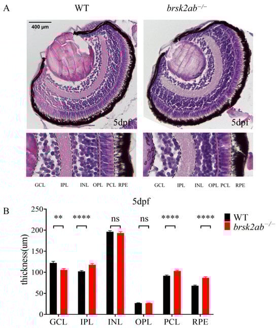 Since photoreceptor function was altered in brsk2ab−/− zebrafish, we first assessed whether this was due to abnormal structural development of the retina. We examined retinal structure and morphology in zebrafish eyes using paraffin sections and HE staining. As shown in Figure 3, the ganglion cell layer (GCL) of brsk2ab−/− zebrafish at 24 hpf exhibited a reduction in thickness (p = 0.0014). Conversely, the inner plexiform layer (IPL) (p < 0.0001), the photoreceptor layer (PCL) (p < 0.0001) and the retinal pigment epithelium (RPE) (p < 0.0001) were observed to be thickened. However, no significant difference was found in the inner nuclear layer (INL) (p = 0.446) and outer plexiform layer (OPL) (p = 0.739). This indicates that the loss of brsk2 impacts the development of all retinal cell layers at early developmental stages.