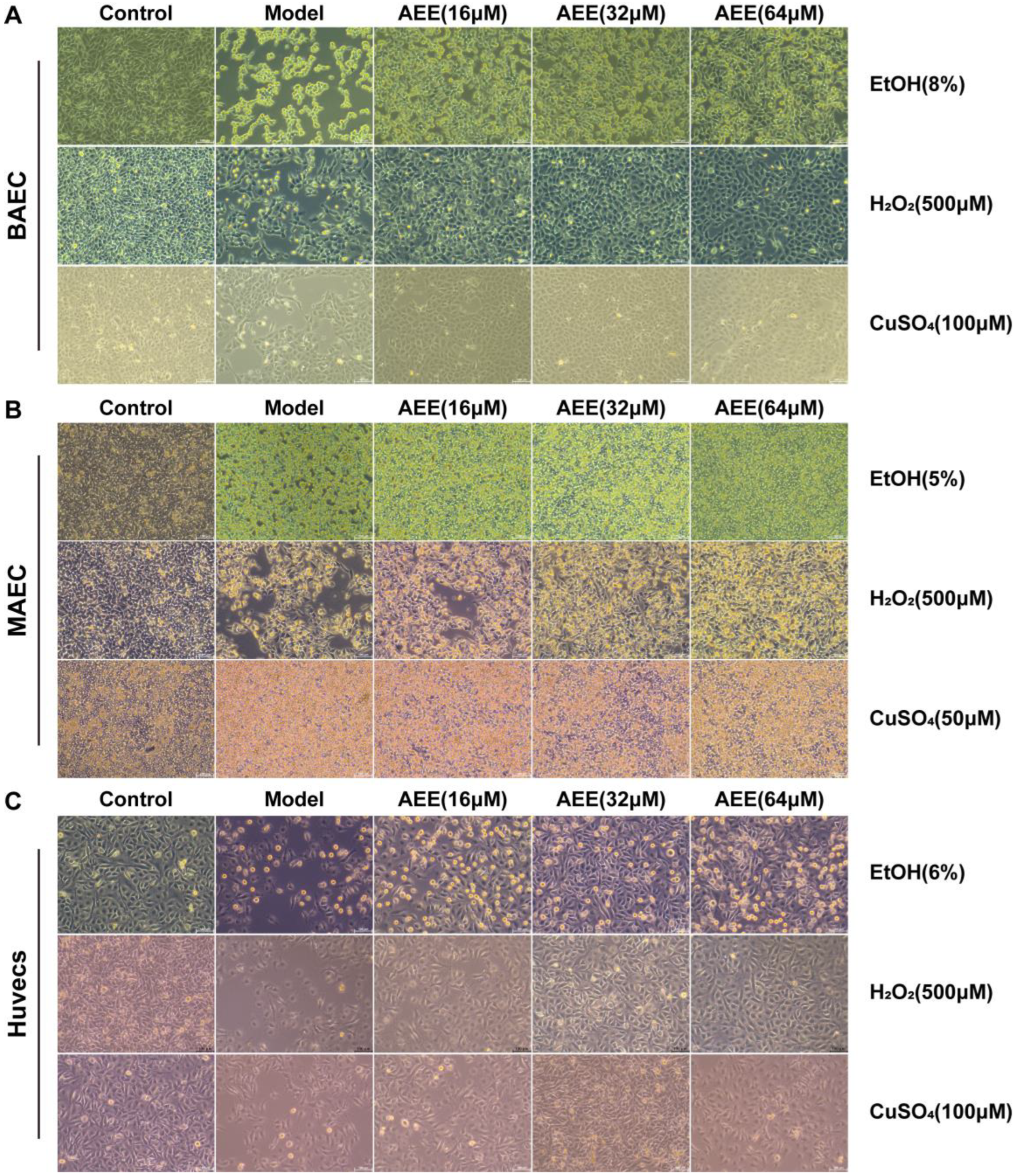 2.2. Protective Effects of AEE Against EtOH, H2O2, and CuSO4 Induced Injury in BAECs, MAECs, and Huvecs