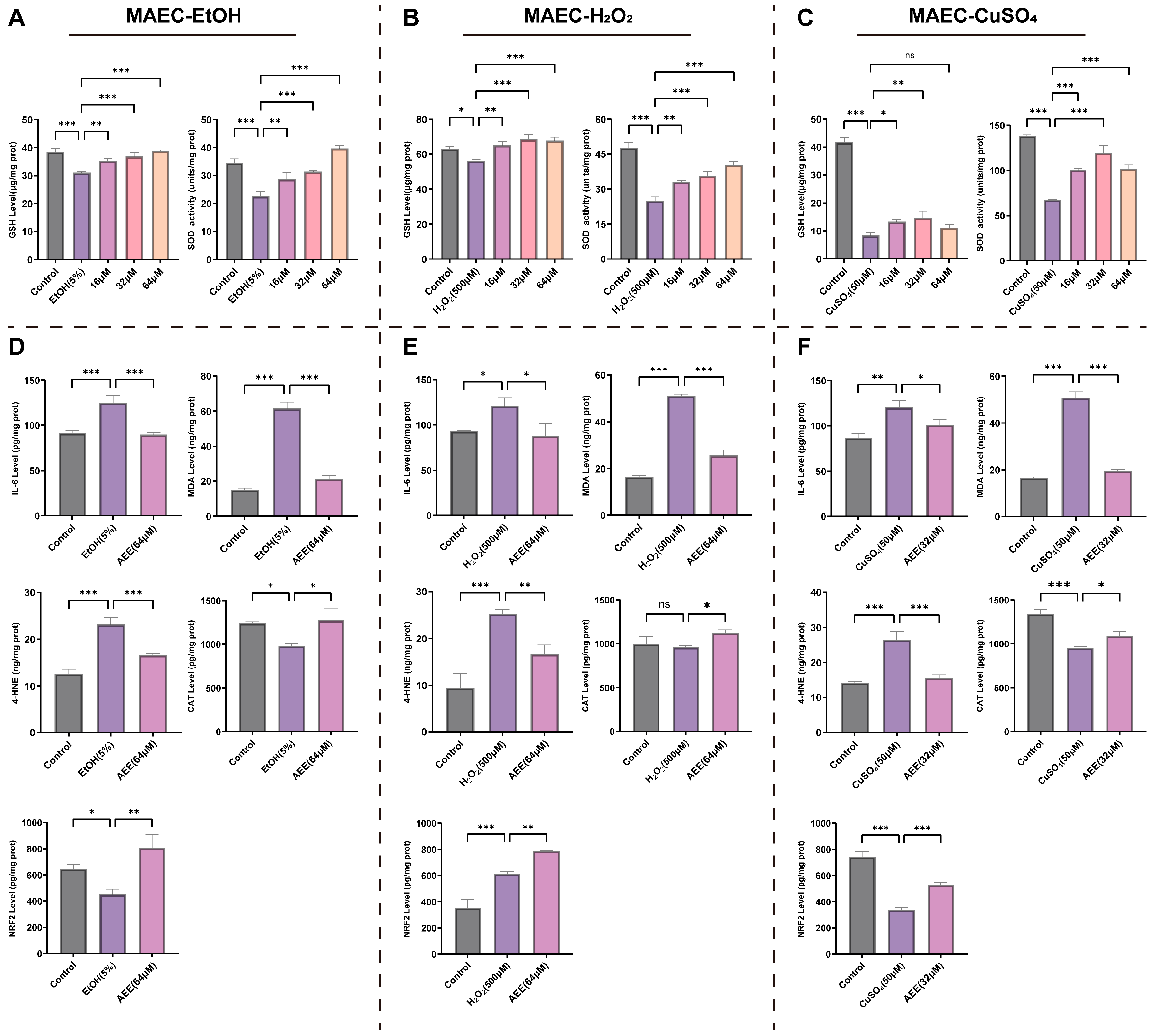 2.3.2. AEE Alleviates EtOH-, H2O2-, or CuSO4-Induced Inflammation and Oxidative Stress in MAECs