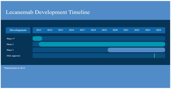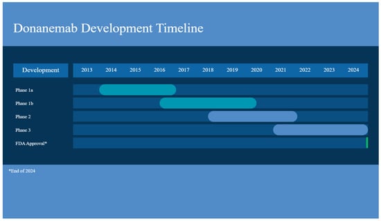 Participants identified to have intermediate tau biomarker levels and clinical symptoms of AD and who were on donanemab had a slowing of decline of 35% in iARDS and 36% in CDR-SB over 18 months [45]. Those on the drug compared to placebo showed a 39% lower risk of progressing to the next stage of disease [45]. ARIA-E and -H occurred in 24% and 31.4% of participants treated with donanemab, “with 6.1% experiencing symptomatic ARIA-E” [45]. Homozygous and heterozygous APOE4 carriers experienced ARIA-E at a higher frequency than noncarriers, 40.6% and 22.8% as opposed to only 15.7% [46]. After the FDA rejection of donanemab for accelerated approval due to insufficient safety data in Phase II, Eli Lilly applied for traditional approval due to the Phase III TRAILBLAZER-ALZ 2 clinical trial’s positive outcomes [25]. Donanemab (brand name Kisunla), received traditional approval from the FDA on 2 July 2024 (Figure 3).