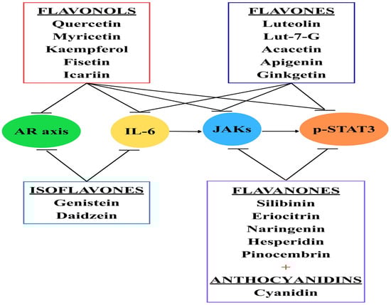 Flavonoids and their effects. Currently, different types of flavonoids are being tested, especially on PC cell lines, with promising results. Flavonols can block JAK receptors, phosphorylated STAT3, IL-6, and even the androgen receptor (AR) axis. Flavones, flavanones, and anthocyanins can inhibit the JAK/STAT3 pathway. Isoflavones target the AR axis and inhibit IL-6.