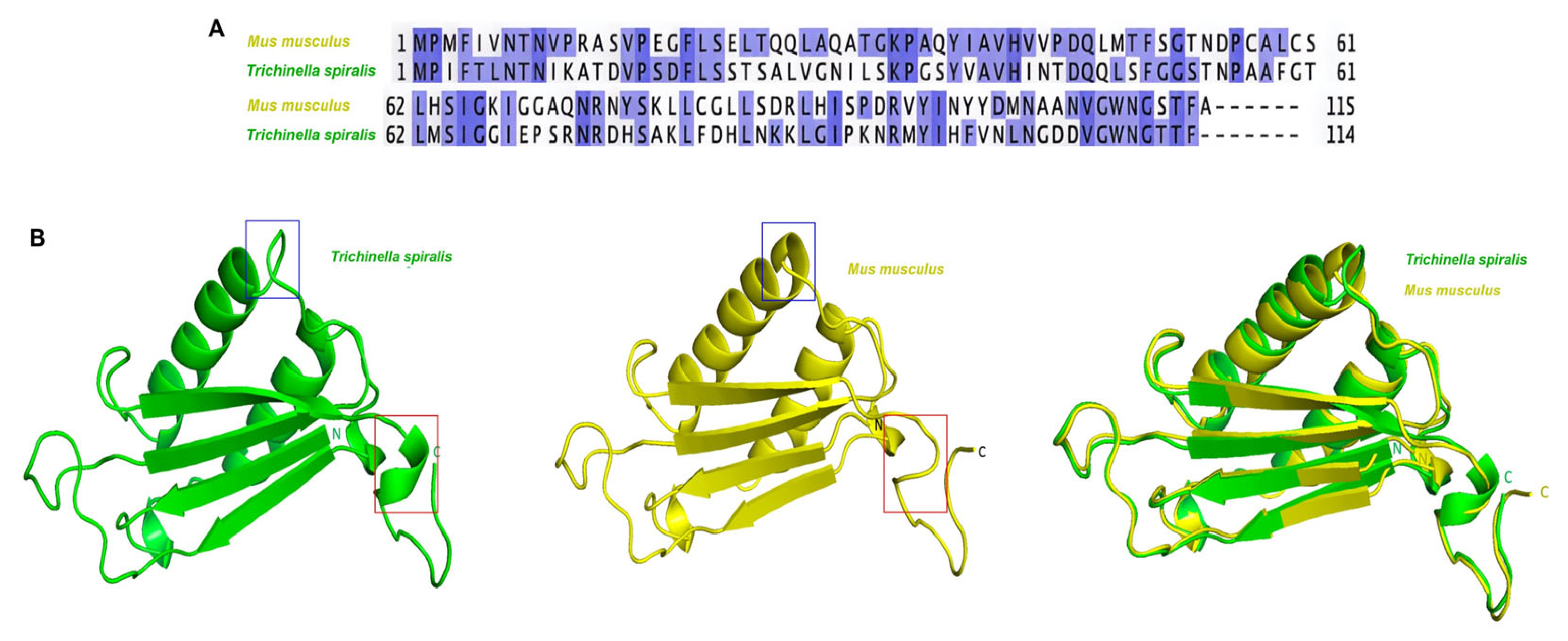Figure 1. Sequence and structural comparison of the MIF associated with T. spiralis and M. musculus. (A) Amino acid sequence alignment of T. spiralis MIF and M. musculus MIF. Conserved residues between the two proteins are highlighted in blue, and the overall sequence identity is approximately 40%. (B) Predicted 3D structures generated using SWISS-MODEL (https://swissmodel.expasy.org/, 7 September 2023) and AlphaFold (https://alphafold.ebi.ac.uk/, 7 September 2023) were superimposed. Although the central β-sheet core is similar between the two proteins, the surface-exposed loop regions (red and blue boxes) differ. These structural differences may influence receptor interaction and immunoregulatory activity.