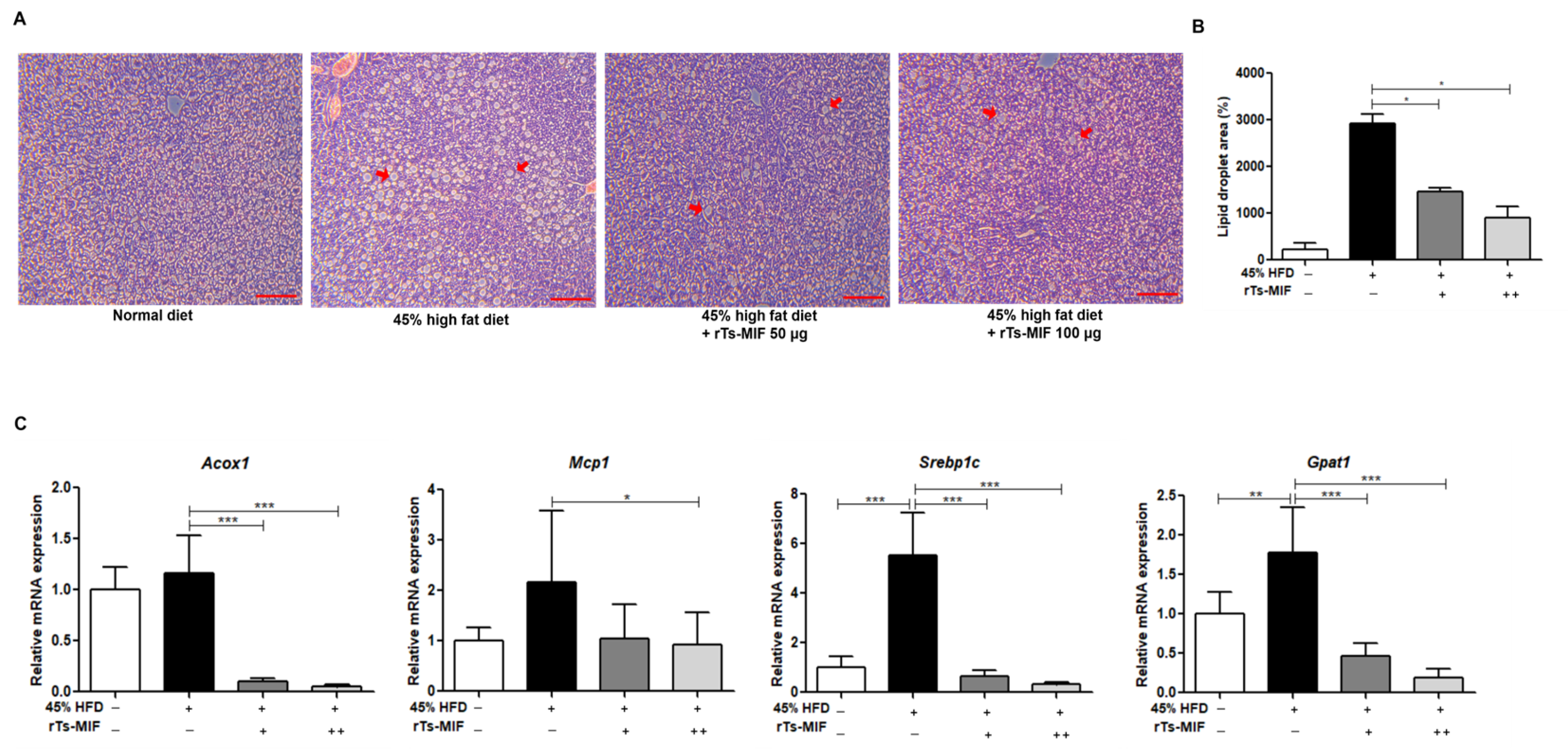 Figure 3. Inhibitory effect of rTs-MIF on hepatic lipid accumulation in a 45% HFD-induced obesity model. (A) Representative H&E-stained liver sections (100×, Scale bar = 50 µm). Large and numerous lipid droplets (red arrows) were observed in HFD mice, whereas lipid accumulation was markedly reduced in rTs-MIF-treated groups. (B) Quantification of hepatic lipid droplet area (%). (C) Hepatic expression of lipid metabolism-related genes (Acox1, Mcp1, Srebp1c, and Gpat1). HFD-induced upregulation of these genes was significantly attenuated by rTs-MIF treatment. ‘+’ indicates mice treated with 50 µg rTs-MIF, and ‘++’ indicates mice treated with 100 µg rTs-MIF. (n = 5 per group; * p < 0.05, ** p < 0.01, and *** p < 0.001).