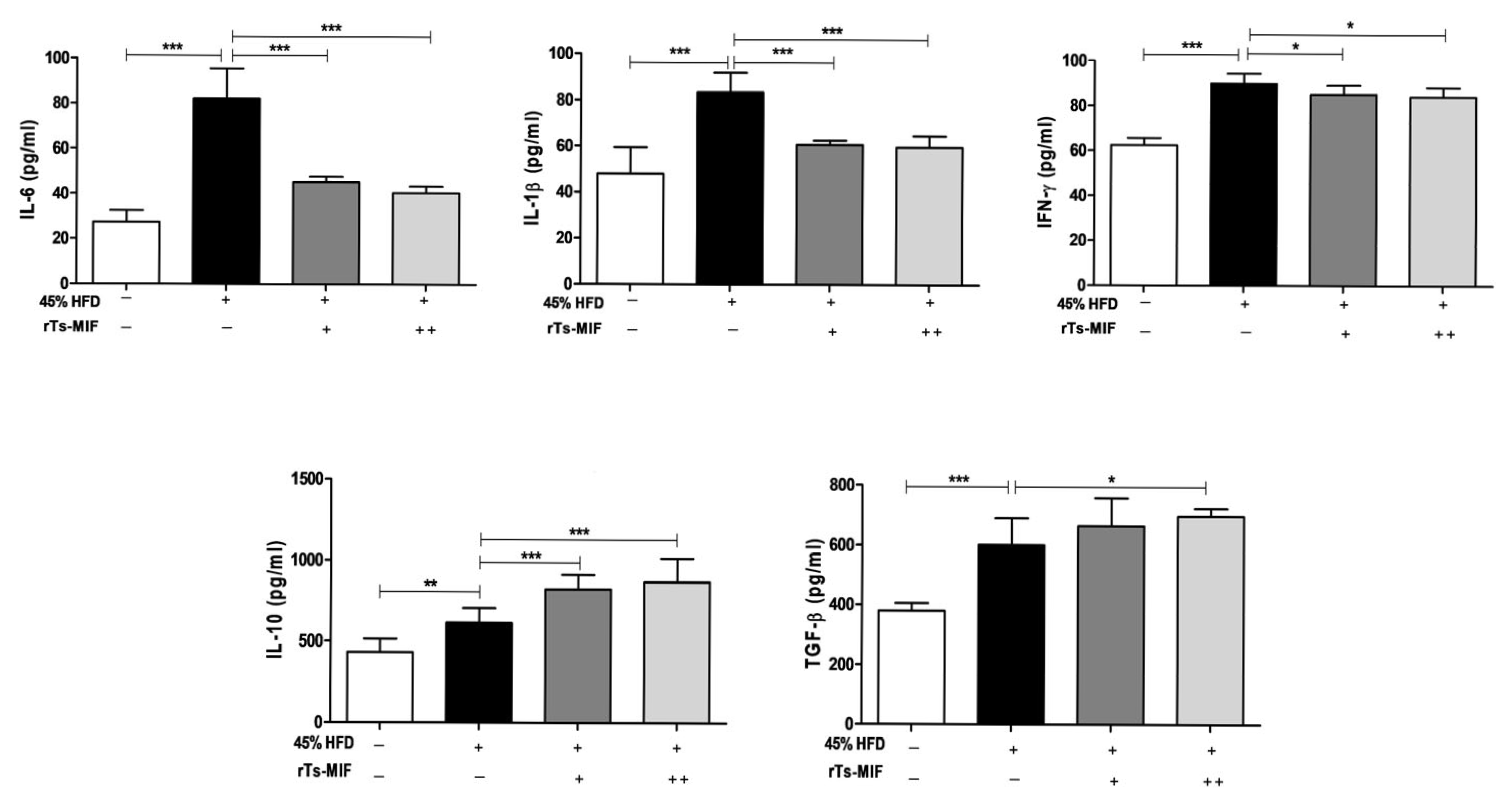 Figure 4. Effects of rTs-MIF on serum pro- and anti-inflammatory cytokine production. Serum cytokine concentrations were measured using ELISA. Pro-inflammatory cytokines (IL-6, IL-1β, and IFN-γ) were reduced in rTs-MIF-treated groups compared with HFD controls. Anti-inflammatory cytokines (IL-10 and TGF-β) were further increased in rTs-MIF-treated mice, indicating a shift toward an anti-inflammatory immune environment. ‘+’ indicates mice treated with 50 µg rTs-MIF, and ‘++’ indicates mice treated with 100 µg rTs-MIF. (n = 5 per group; * p < 0.05, ** p < 0.01, and *** p < 0.001).
