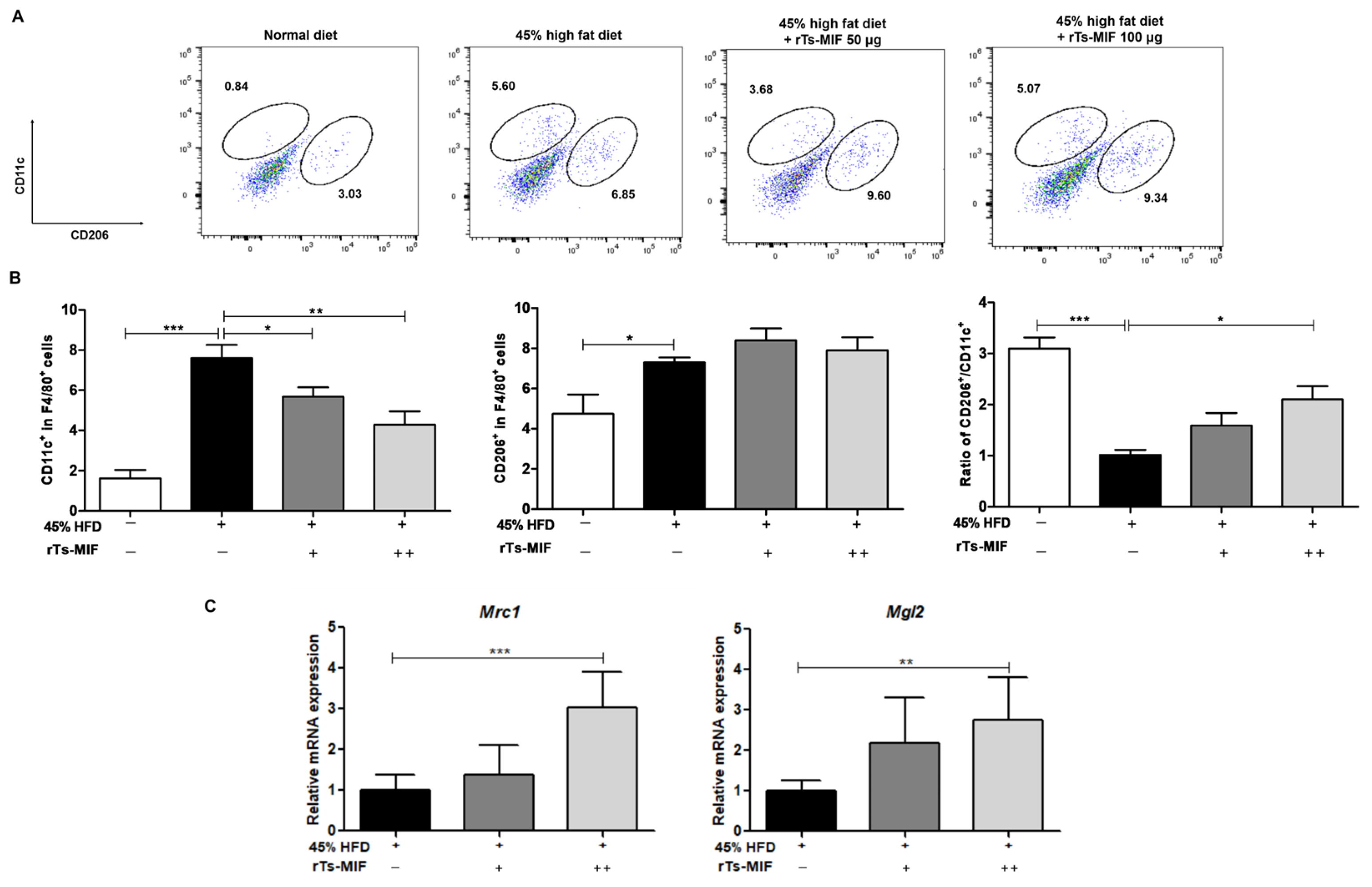 Figure 5. Regulatory effects of rTs-MIF on macrophage populations in adipose tissue. (A) Flow cytometric analysis of CD11c+ M1 and CD206+ M2 macrophages in the stromal vascular fraction (SVF) of epididymal white adipose tissue (eWAT). (B) Quantification of CD11c+F4/80+ (M1) and CD206+F4/80+ (M2) macrophages and calculation of the M2/M1 ratio. rTs-MIF treatment significantly reduced M1 macrophages and increased the M2/M1 ratio. (C) mRNA expression of M2-associated marker genes Mrc1, and Mgl2 in eWAT, both of which were significantly upregulated in rTs-MIF-treated groups. ‘+’ indicates mice treated with 50 µg rTs-MIF, and ‘++’ indicates mice treated with 100 µg rTs-MIF. (n = 5 per group; * p < 0.05, ** p < 0.01, and *** p < 0.001).