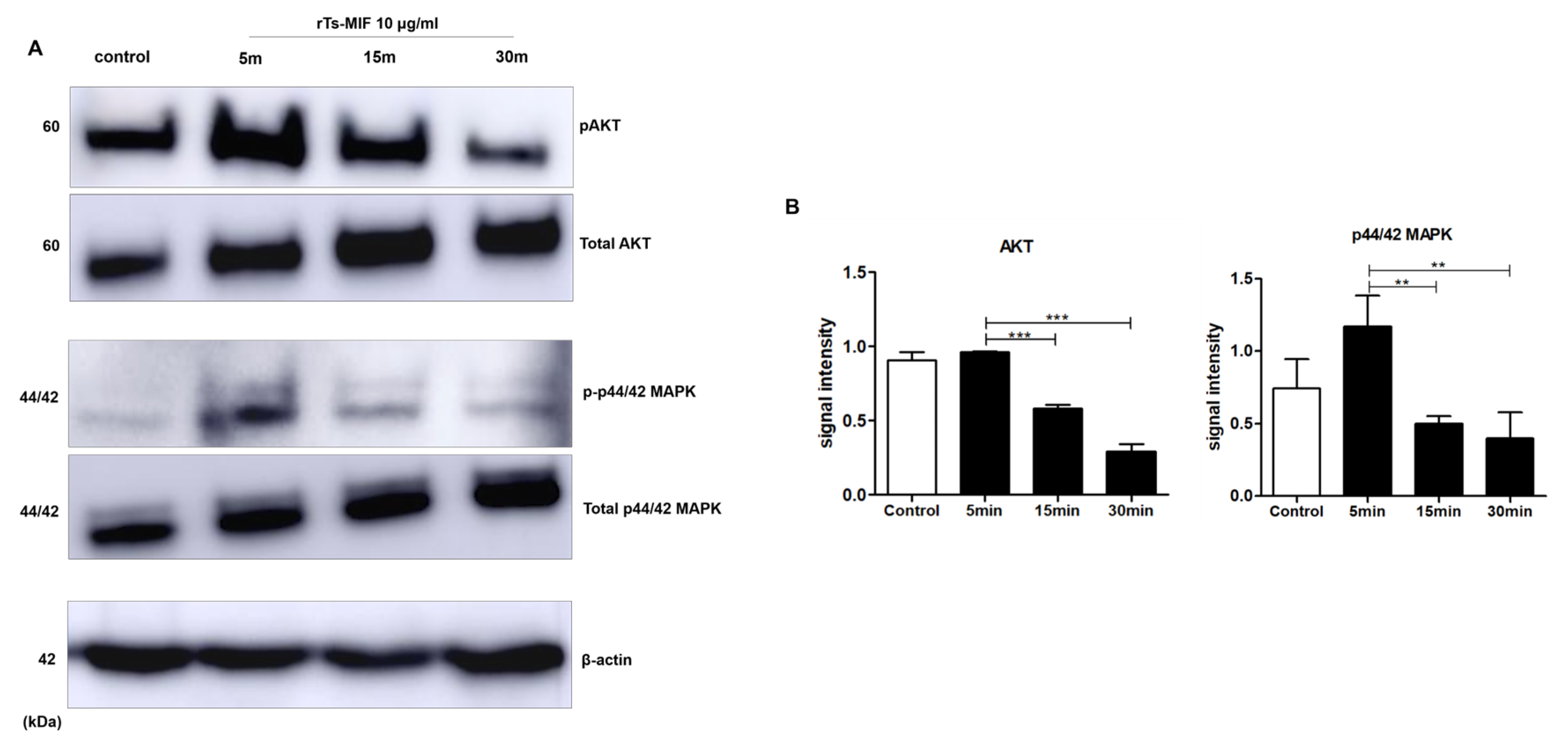 Figure 7. Modulatory effects of rTs-MIF on obesity-related signaling pathways. (A) Western blot analysis of AKT and p44/42 MAPK phosphorylation in 3T3-L1 cells treated with 10 µg/mL rTs-MIF for 5, 15, or 30 min. β-actin was used as a loading control. (B) Quantification of band intensities. Phosphorylation of both AKT and p44/42 MAPK increased transiently at 5 min and declined at later time points. (n = 3 independent experiments; ** p < 0.01, and *** p < 0.001).