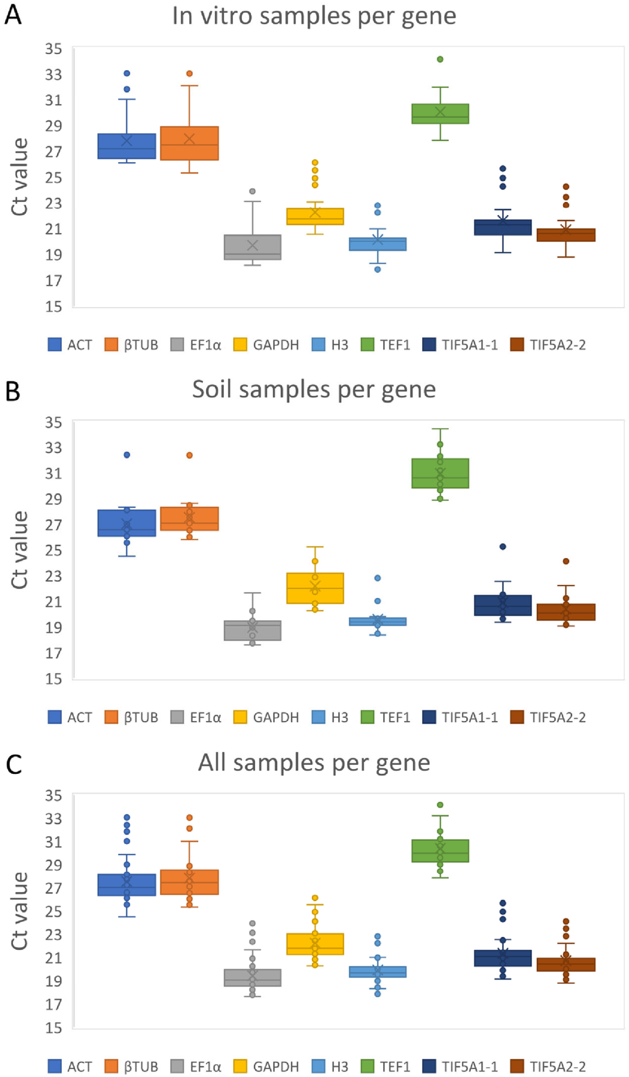 | BestKeeper | H3 | TIF5A1-2 | TIF5A1-1 | βTUB | EF1α | GAPDH | ACT | TEF1 | |