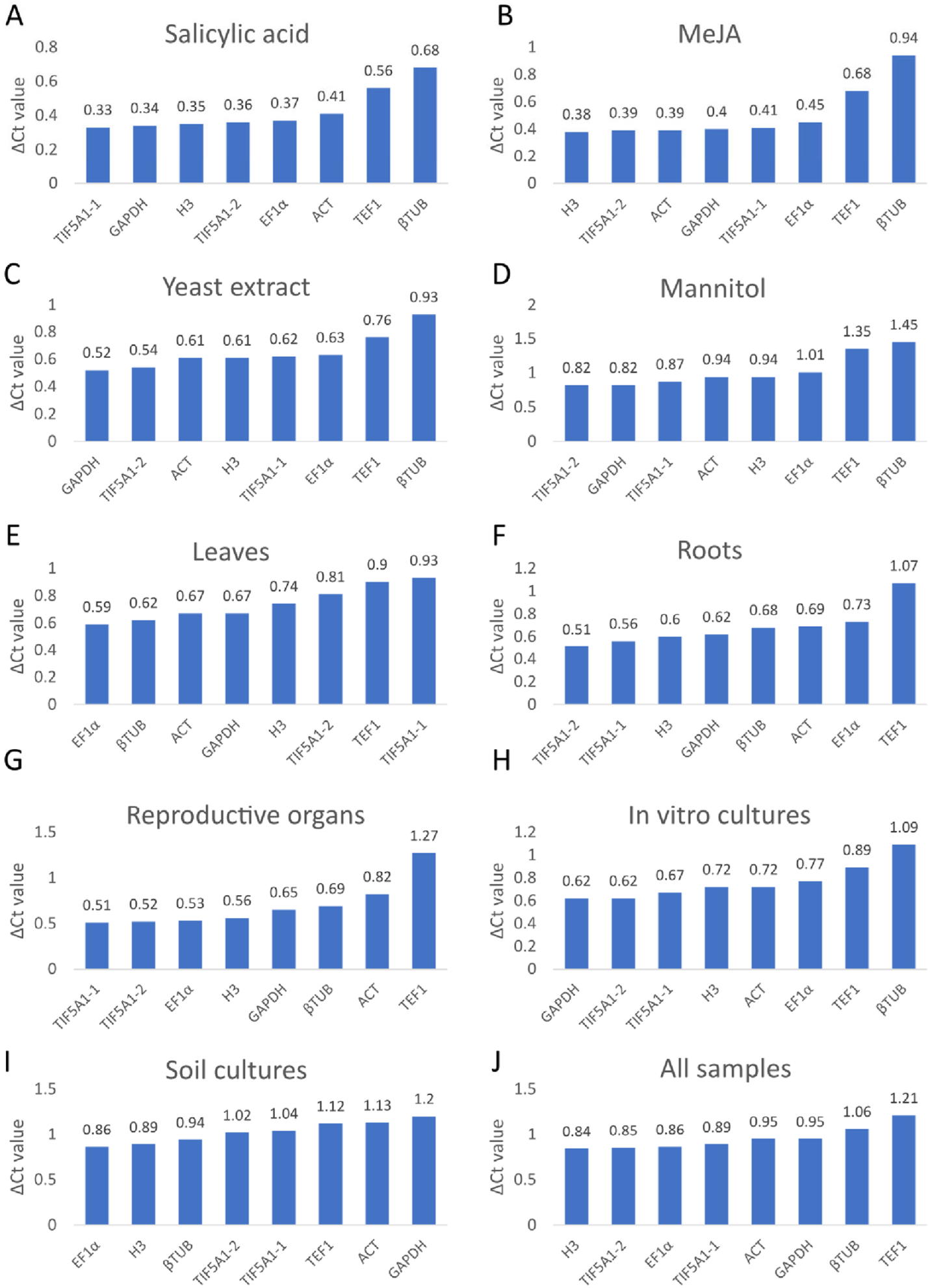 | ΔCT | EF1α | βTUB | ACT | GAPDH | H3 | TIF5A1-2 | TEF1 | TIF5A1-1 | |