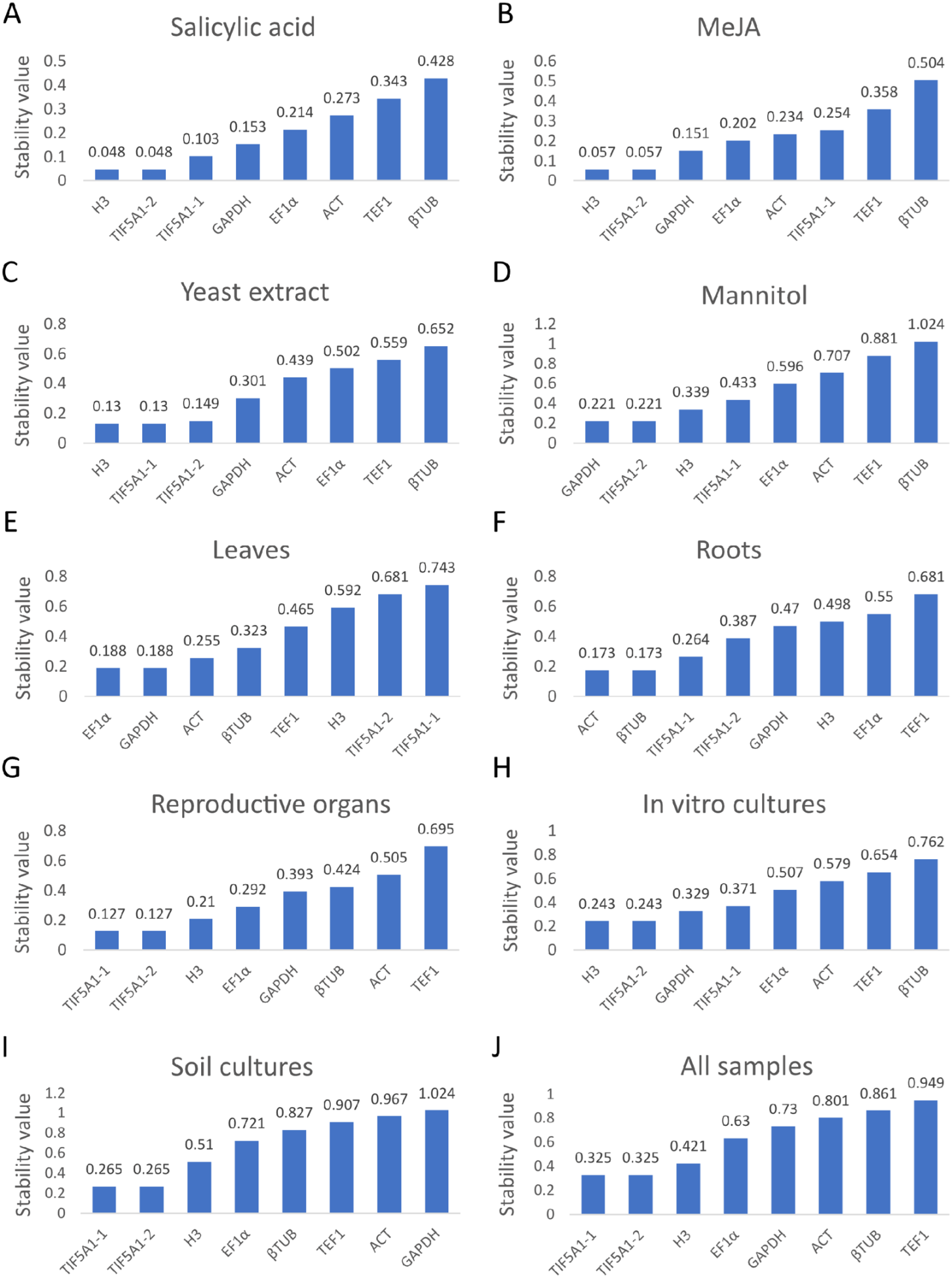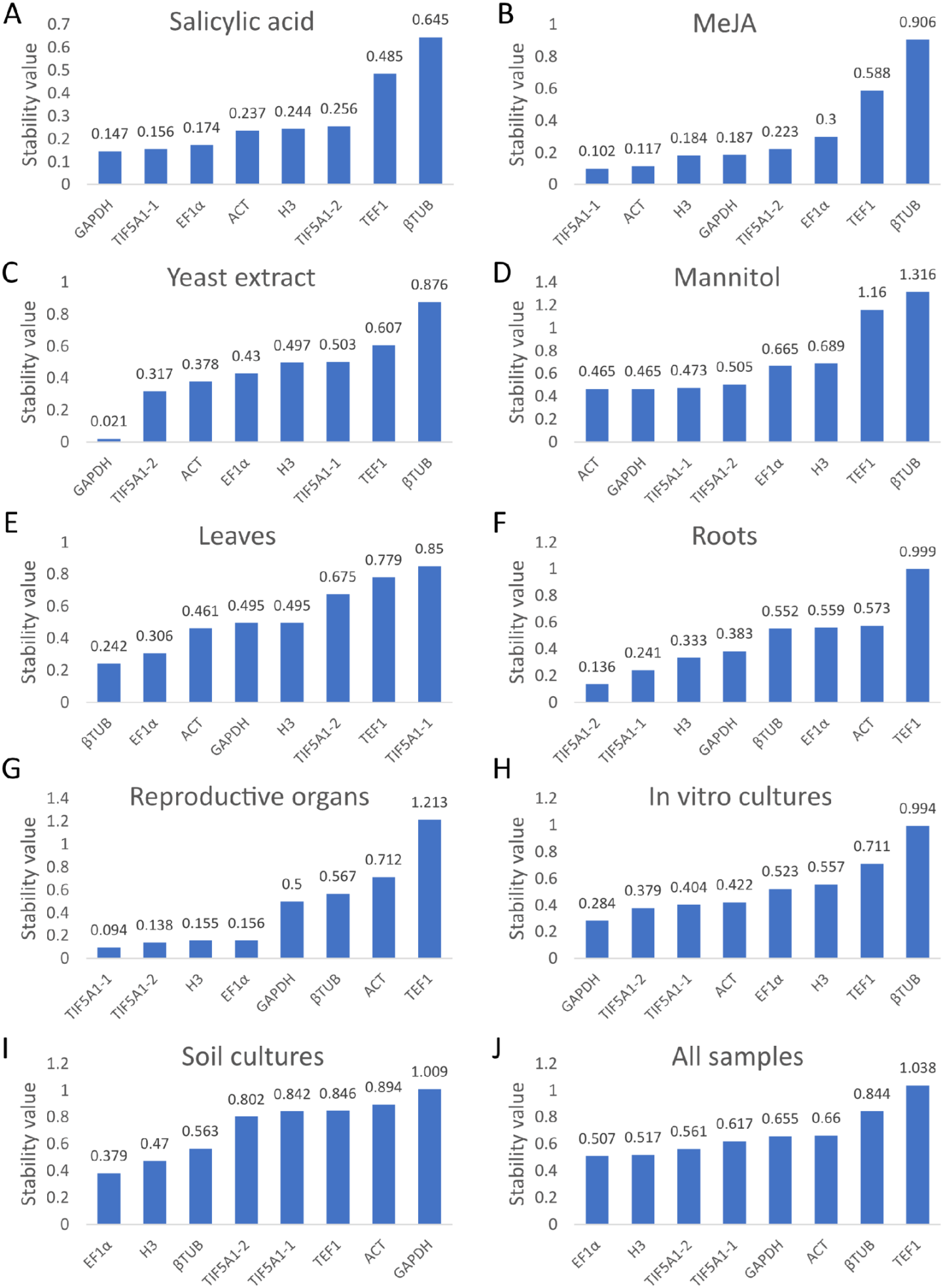 | NormFinder | GAPDH | TIF5A1-2 | ACT | EF1α | H3 | TIF5A1-1 | TEF1 | βTUB | |