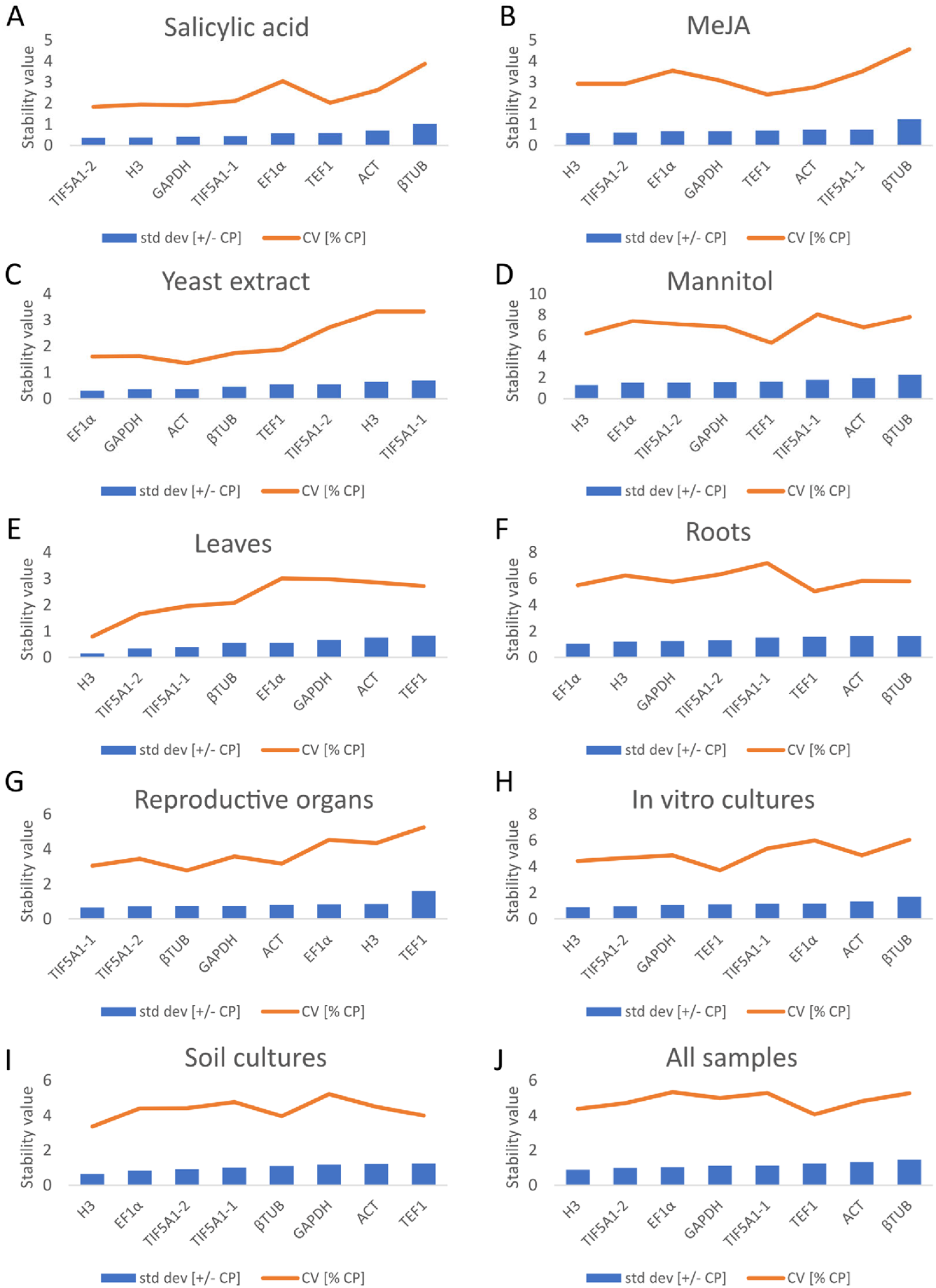 | BestKeeper | H3 | TIF5A1-2 | EF1α | GAPDH | TEF1 | ACT | TIF5A1-1 | βTUB | |