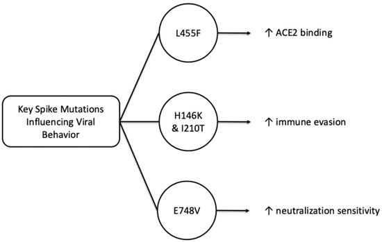 Key Spike protein mutations in recent SARS-CoV-2 Omicron sublineages influencing viral behavior. Schematic summary of selected Spike substitutions discussed in Section 2.1 and their reported functional associations: L455F with increased ACE2 binding, H146K/I210T with increased immune evasion, and E748V with increased neutralization sensitivity.