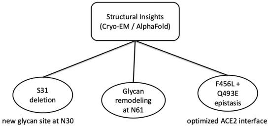 Structural effects of Spike protein mutations of SARS-CoV-2 inferred from cryo-EM and AI-assisted modeling. Schematic overview of key structural features reported for recent Omicron sublineages, including the S31 deletion associated with the emergence of a novel glycosylation site at N30; glycan remodeling at N61; epistatic interactions between F456L and Q493E that optimize the Spike- ACE2 interface. These features are primarily derived from cryo-EM reconstructions and AlphaFold-based structural predictions.