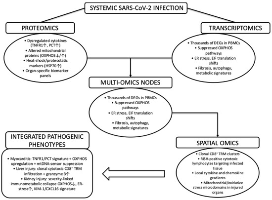 Multi-omics integration of systemic SARS-CoV-2 induced host responses. Schematic representation of how proteomic, transcriptomic, and spatial-omics datasets converge to define systemic and organ-specific pathogenic phenotypes in SARS-CoV-2 infection. Proteomic analyses highlight dysregulated inflammatory mediators, mitochondrial dysfunction, and proteostatic stress, while transcriptomic profiling reveals large-scale transcriptional reprogramming. These include suppression of oxidative phosphorylation pathways and activation of endoplasmic reticulum stress responses. Integration of these datasets identifies shared multi-omics nodes that are further resolved by spatial-omics approaches. Such approaches are linking molecular alterations to tissue-localized immune cell infiltration, metabolic stress microdomains, and distinct clinical phenotypes such as myocarditis, liver injury, and acute kidney injury. The symbol ‘↓’ denotes a decrease, ‘↑’ denotes an increase, and ‘+’ indicates in combination with.