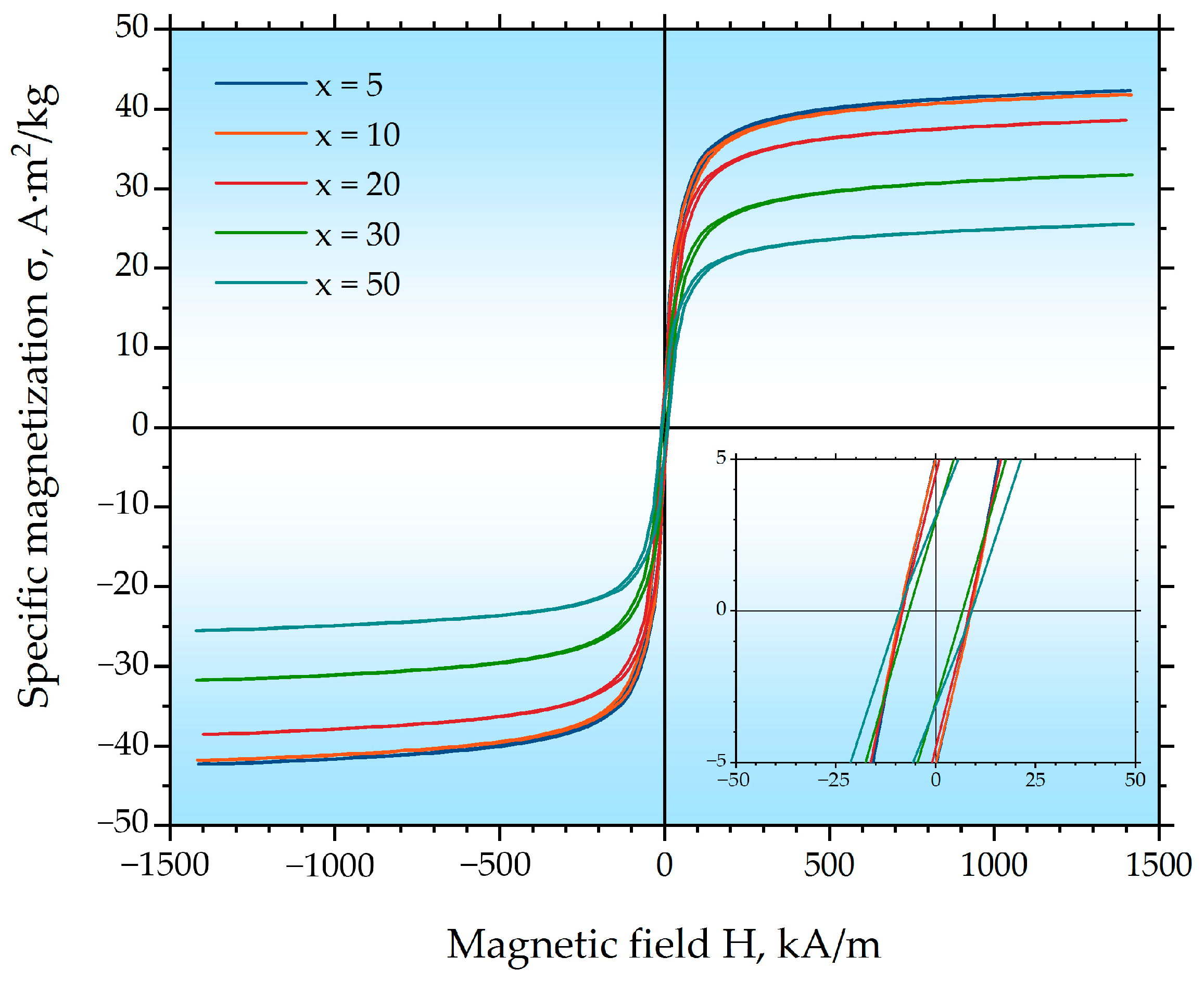 | x = 50 | 9 ± 1 | 3.1 ± 0.1 | 25.5 ± 0.2 | 0.4 ± 0.1 | 164 ± 5 |