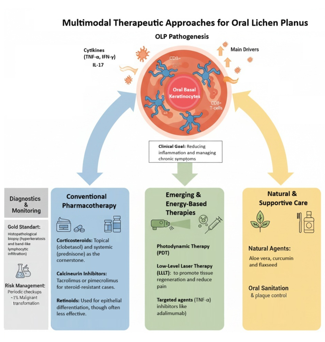 - Gupta, S.; Ghosh, S.; Gupta, S. Interventions for the management of oral lichen planus: A review of the conventional and novel therapies. Oral Dis. 2017, 23, 1029–1042. [Google Scholar] [CrossRef]