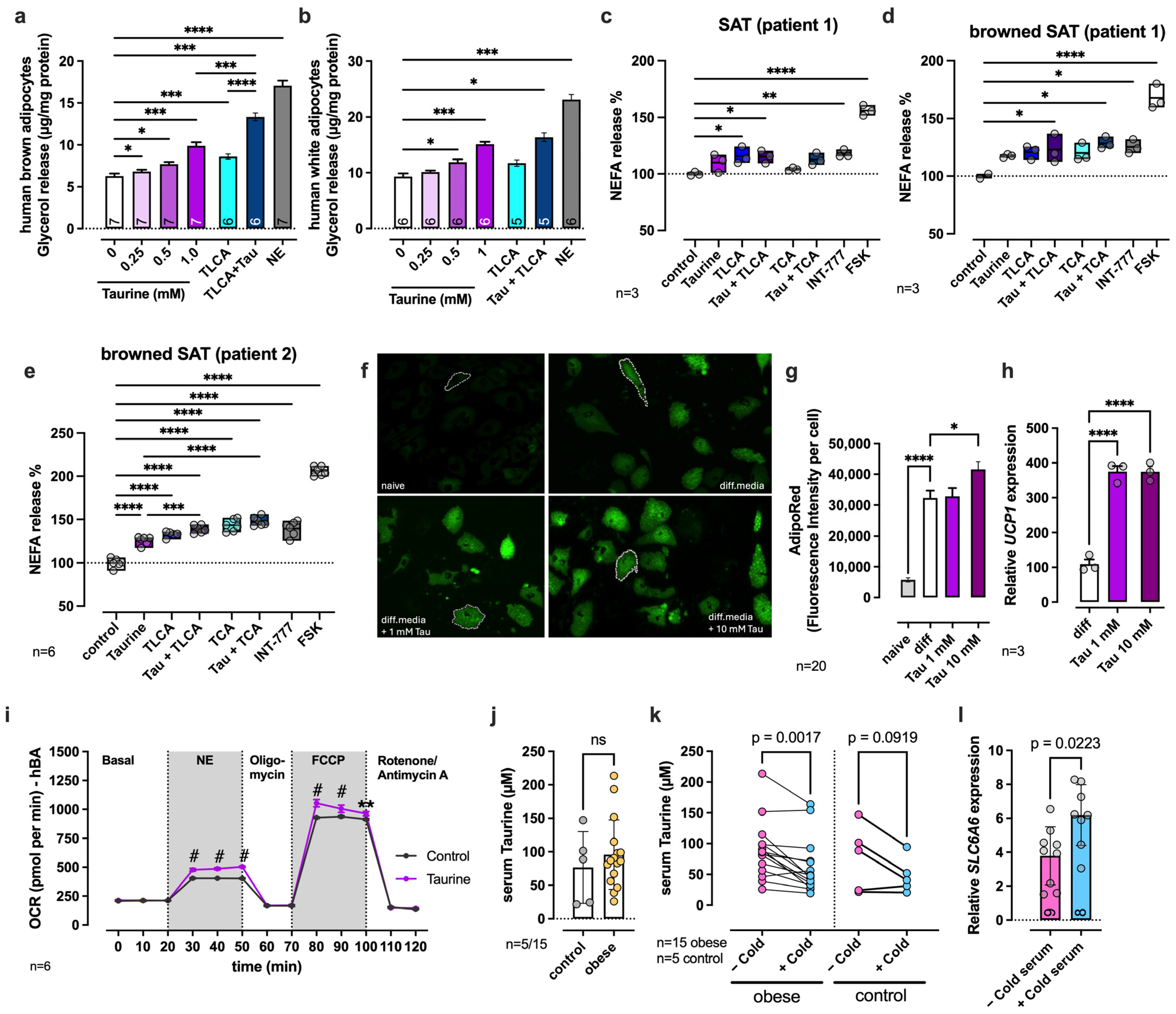 2.6. Taurine Enhances Lipolysis, Browning, and Respiratory Capacity in Human Adipocytes