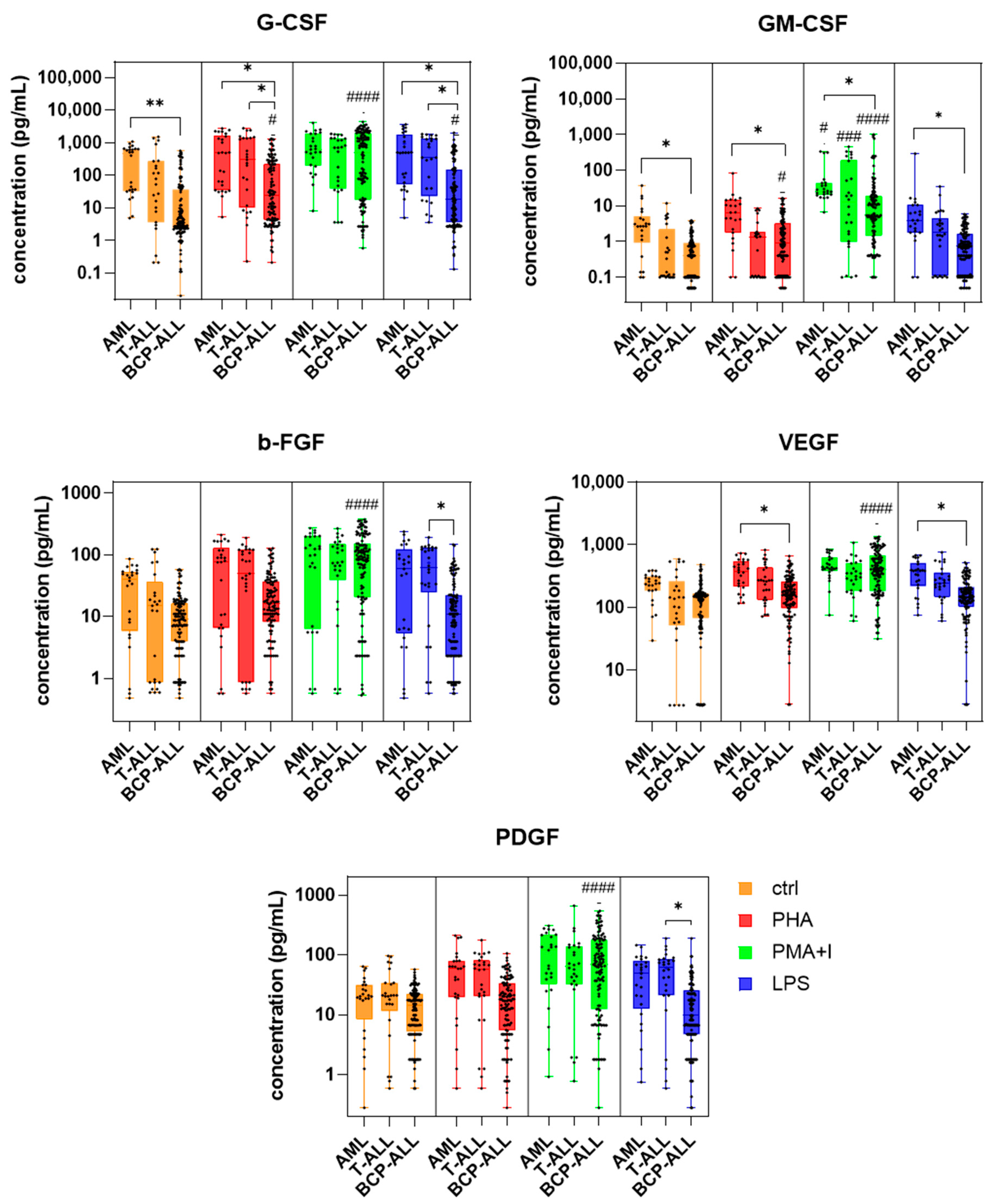 Kozub, A.; Szarek, R.; Szczęsny, M.; Jaworska, D.; Młynarski, W.; Kowalczyk, J.; Szczepański, T.; Czuba, Z.P.; Sędek, Ł. Profiles of Growth Factors Secreted by In Vitro-Stimulated Paediatric Acute Leukaemia Blasts of Myeloid and Lymphoid Origin. Int. J. Mol. Sci. 2026, 27, 933. https://doi.org/10.3390/ijms27020933