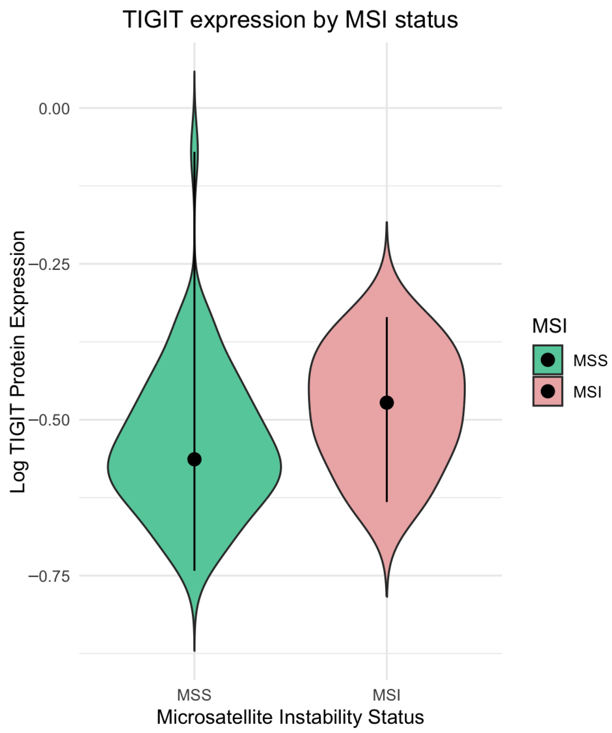 In line with the above findings, our results further support that MSI status is associated with enhanced immune checkpoint expression in CRC. In our cohort, tumors classified as MSI on the basis of IHC assessment of MMR protein loss showed significantly higher TIGIT protein levels compared with the MSS tumor group. These data are consistent with transcriptomic observations from the analyses by Wen et al. and Zaravinos et al., who reported positive associations between TIGIT expression, MSI-related signatures, tumor mutational burden, and immune cytolytic activity in CRC [
