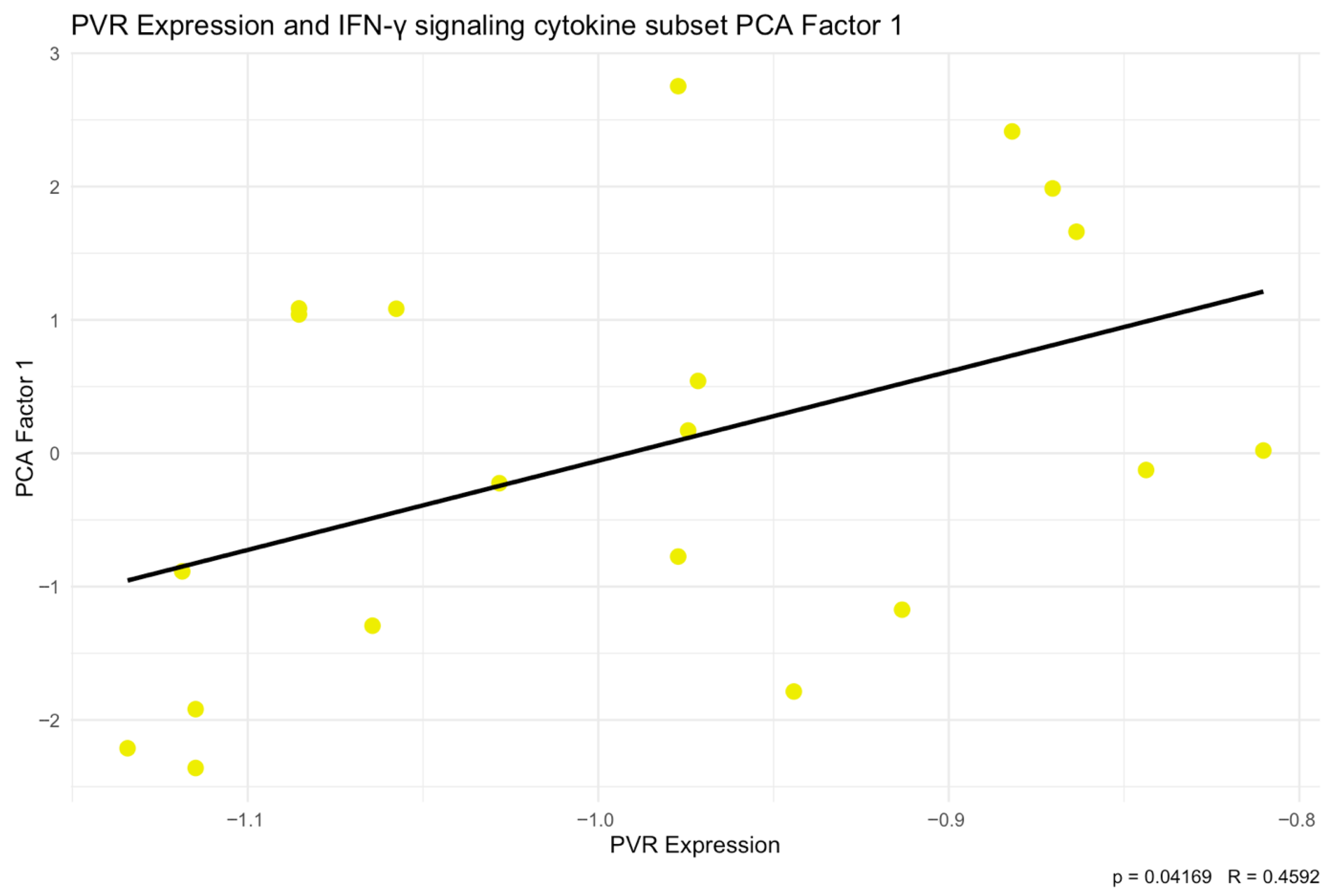 74]. In bulk CRC tumors, positive correlations can still occur because immune-inflamed samples often show both higher IFN-g and higher checkpoint molecules, reflecting immune activation together with feedback inhibition, which means that higher immune checkpoint expression may reduce further immune activation and cytokine production in consequence. Moreover, integrating our experimental PCA/correlation results with the GSEA findings places TIGIT in CRC firmly in the context of an IFN-g-driven, immune-inflamed TME, where active antitumor immunity coexists with checkpoint-mediated restraint. As an inhibitory receptor on T and NK cells, TIGIT is plausibly induced as part of adaptive immune resistance: sustained IFN-g signaling and downstream IFN-g–dependent cytokine programs reflect immune engagement, while concomitant TIGIT upregulation may potentially represent a compensatory inhibition that can limit cytotoxic effector function and promote functional exhaustion. Translationally, this co-occurrence suggests that TIGIT-high/IFN-g-high CRC tumors may define a clinically actionable subgroup characterized by pre-existing immune activation but incomplete tumor rejection, in which a therapeutic strategy based on inhibitory signaling could be potentially beneficial. In contrast, CD155 showed a broader association pattern that included growth-factor and myeloid/stromal mediators, such as PDGF-bb, M-CSF, and TRAIL and, at the pathway level, preferential enrichment of proliferative programs (MYC/E2F/G2M), suggesting that CD155 abundance in bulk tissue may more strongly reflect tumor/stromal remodeling and tumor cell–intrinsic programs than immune activation alone. Importantly, this divergence implies that interpreting the TIGIT/CD155 axis and prioritizing TIGIT-directed immunotherapy strategies may require patient stratification by immune context (MSI/BRAF-associated immune-inflamed subsets) because TIGIT-high tumors could represent settings where combination checkpoint blockade is biologically more plausible, whereas CD155-high tumors may indicate a proliferative, microenvironmentally remodeled state that could benefit from different or additional combinatorial approaches. The precise associations between the TIGIT/CD155 axis proteins and interferon-related signaling in CRC require further investigation. Future studies using approaches that resolve cell-type specificity and enable functional testing will be needed to determine whether these associations reflect a direct regulatory link or are driven primarily by differences in CRC TME composition.