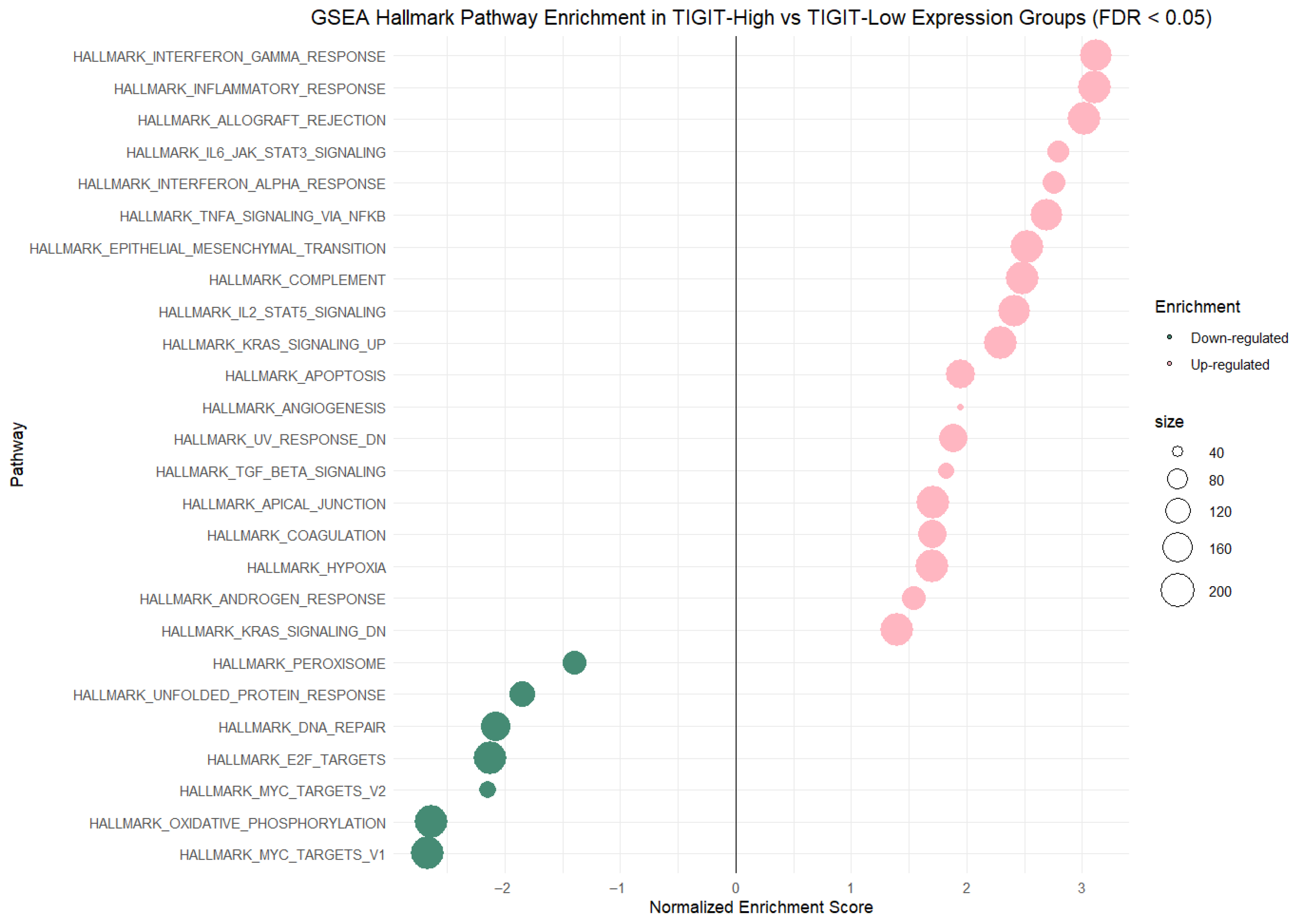 42]. By contrast, numerous other studies have linked TIGIT overexpression to unfavorable prognosis and more advanced disease. Cao et al., analyzing transcriptomic data from CRC patients, reported that elevated TIGIT expression was associated with poorer OS and DFS [