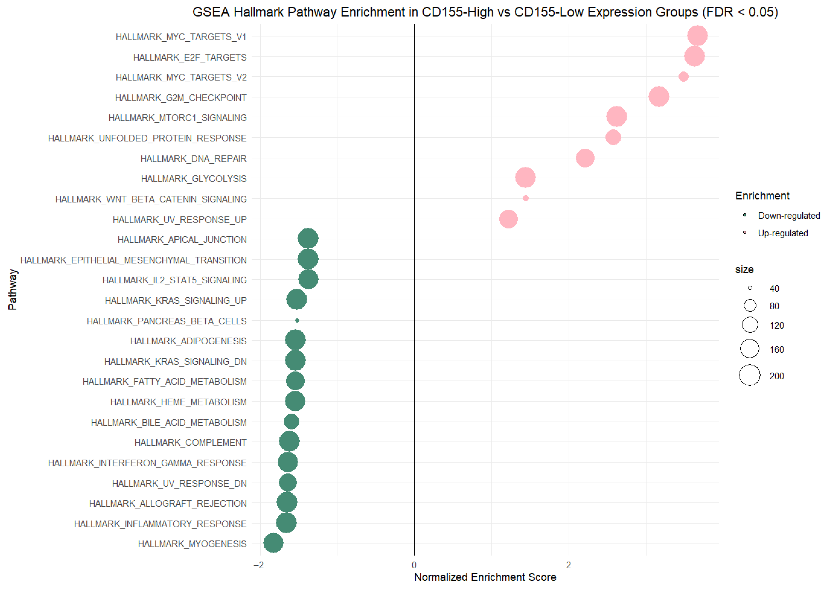 Integration of our own cytokine correlation analysis and GSEA results suggests that the TIGIT/CD155 immune checkpoint axis may be associated with multiple immune-related pathways in CRC tumor tissues. In our protein measurements of selected 48 cytokines, chemokines, and growth factors, only a few significant correlations were detected, but IFN-g distinguish as a shared correlate, showing positive associations with TIGIT and CD155. CD155 was also positively correlated with TRAIL, IL-1Ra, M-CSF, and PDGF-bb, suggesting that higher CD155 can accompany a broader inflammatory or growth-factor tumor milieu. These experimental findings fit well with the indicated GSEA results: TIGIT-high samples were enriched for immune and inflammation-related pathways, including the IFN-g response, consistent with TIGIT marking a more immune-inflamed TME in tumor tissues. In contrast, CD155-high samples were enriched mainly for proliferation and growth programs (MYC/E2F/G2M signatures), while immune/inflammatory pathways (including IFN-related programs) were more prominent in CD155-low, producing an apparent opposite pattern between TIGIT and CD155 at the pathway level. Importantly, this does not conflict with previous functional studies showing that TIGIT/CD155 signaling can reduce IFN-g production by T and NK cell [