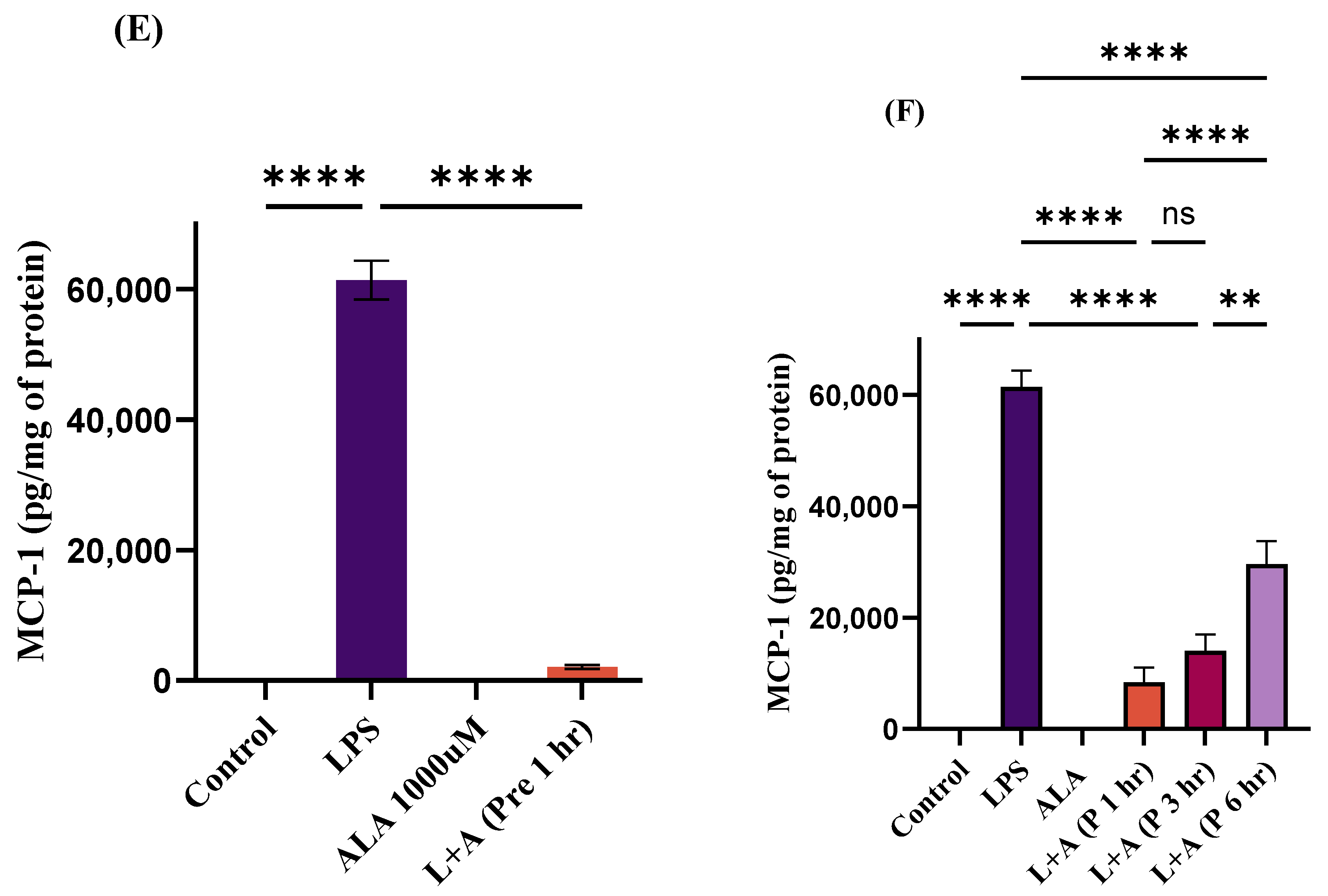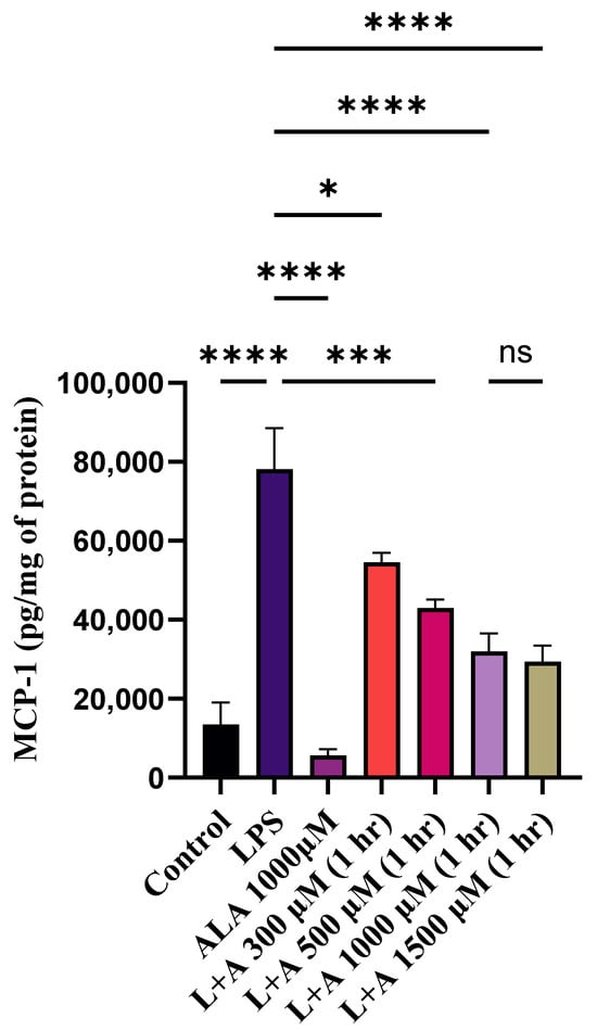 Dose-dependent assay for ALA in LPS-stimulated macrophages. LPS stimulation significantly increased the release of MCP-1. Maximum protective effect was observed at 1000 µM and 1500 µM ALA. For subsequent in vitro experiments, 1000 µM was selected as an optimal concentration. Results are expressed in pg/mg of protein and represented as mean ± SEM (n = 3). Each experiment was performed in triplicate on three different days. A one-way ANOVA with a post hoc Tukey test was used. Statistical significance was determined at * p < 0.05; *** p < 0.001; **** p < 0.0001; and non-significant (ns).