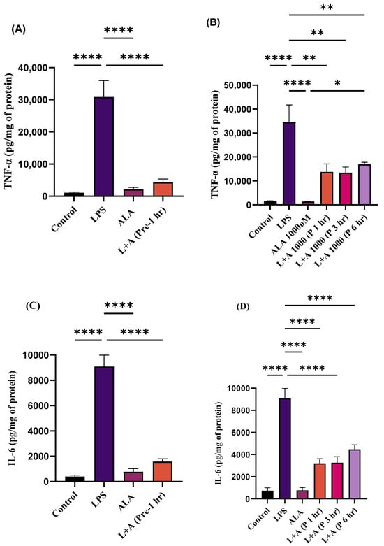 (A–F) Effect of ALA treatment either 1 h before (pre-treatment) or 1, 3, and 6 h post LPS stimulation in RAW 264.7 macrophages. LPS stimulation significantly increased the levels of TNF-α, IL-6, and MCP-1. Pre- and post-treatment with ALA in LPS-stimulated RAW 264.7 macrophages significantly reduced the release of MCP-1, TNF-α, and IL-6. Results are expressed in pg/mg of protein and represented as mean ± SEM (n = 3). Each experiment was performed in triplicate on three different days. A one-way ANOVA with a post hoc Tukey test was used. Statistical significance was determined at * p < 0.05; ** p < 0.01; **** p < 0.0001; and non-significant (ns). The quantitative ELISA data are provided in Supplementary Table S1.