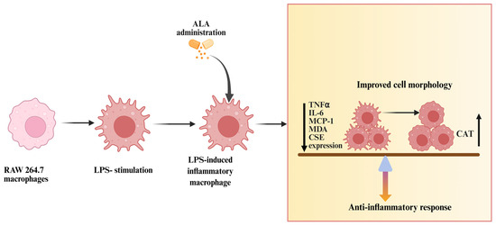 In conclusion (Figure 7), in the present study, we have demonstrated for the first time that ALA significantly protects against cell injury in LPS-stimulated macrophages at both pre- and post-treatment at different time points. Although the role of ALA in several diseases has been reported, the underlying mechanisms remain unclear. The striking findings of this study are that ALA preserved cell morphology, decreased the levels of cytokines, chemokines, and MDA and increased the CAT activity by modulating the CSE/H2S pathway in a time-dependent manner. These results are a significant contribution to our understanding of the mechanisms by which ALA contributes to the mitigation of inflammation and could contribute to the management of different inflammatory conditions such as sepsis.