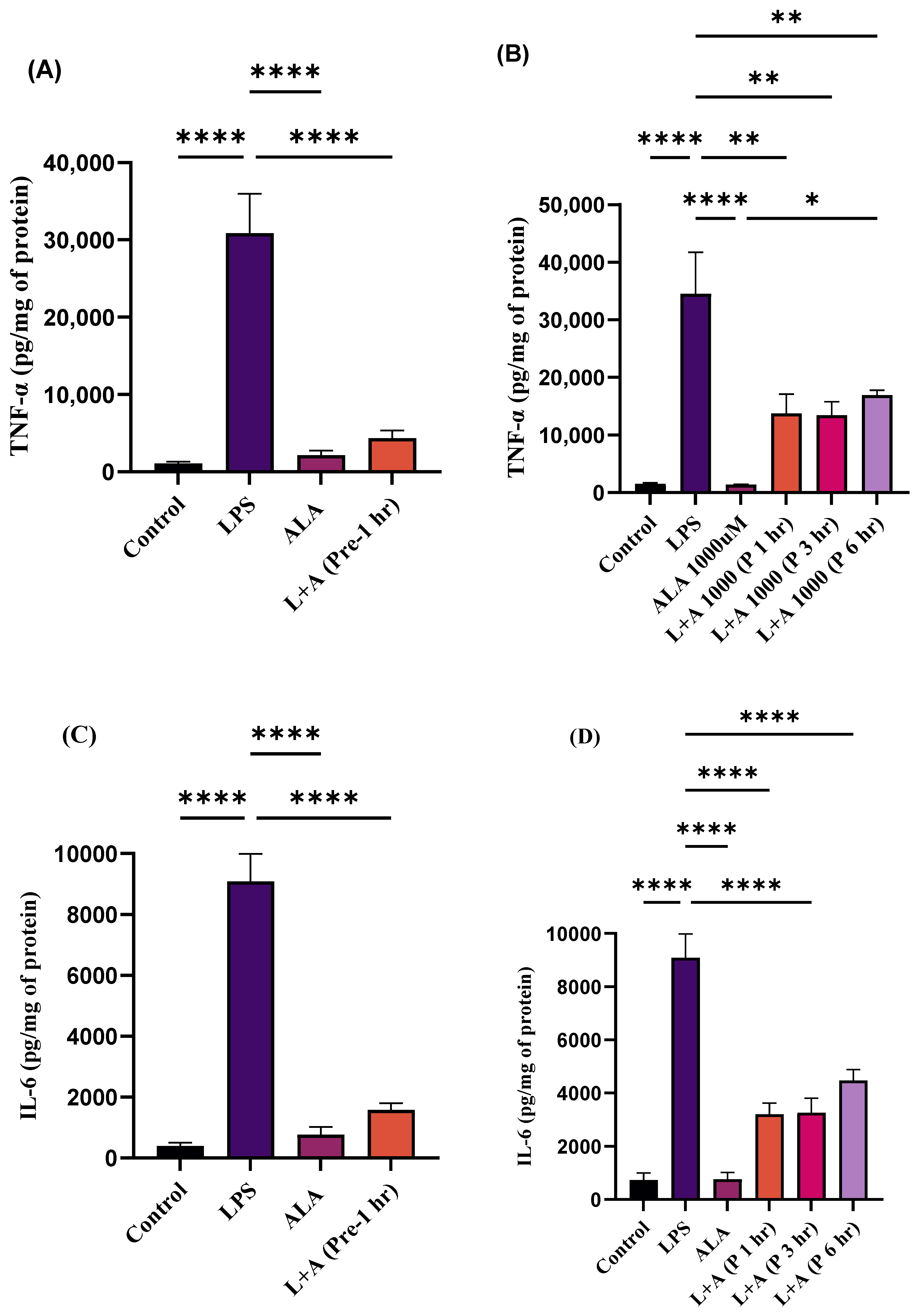 LPS treatment significantly increases MCP-1, IL-6, TNF-α, and IL-1β levels in macrophages and contributes to pro-inflammatory responses [14]. Results in the present study show that LPS stimulation (100 ng/mL) significantly increased the levels of MCP-1, IL-6, and TNF-α in RAW 264.7 macrophages. ALA treatment either 1 h before or 1, 3, and 6 h post-stimulation to LPS in RAW 264.7 macrophages showed an anti-inflammatory effect as evidenced by the decreased levels of MCP-1, TNF-α, and IL-6. The anti-inflammatory effects of ALA in this study are consistent with previous studies, highlighting that ALA pretreatment shows anti-inflammatory effects by reducing the levels of cytokines and chemokines after an inflammatory stimulus [15,16]. ALA showed maximum protection against LPS-induced inflammation at 1 h before LPS stimulation. However, it is important to note the protection was observed when cells were treated with ALA 1, 3, and 6 h post LPS stimulation.