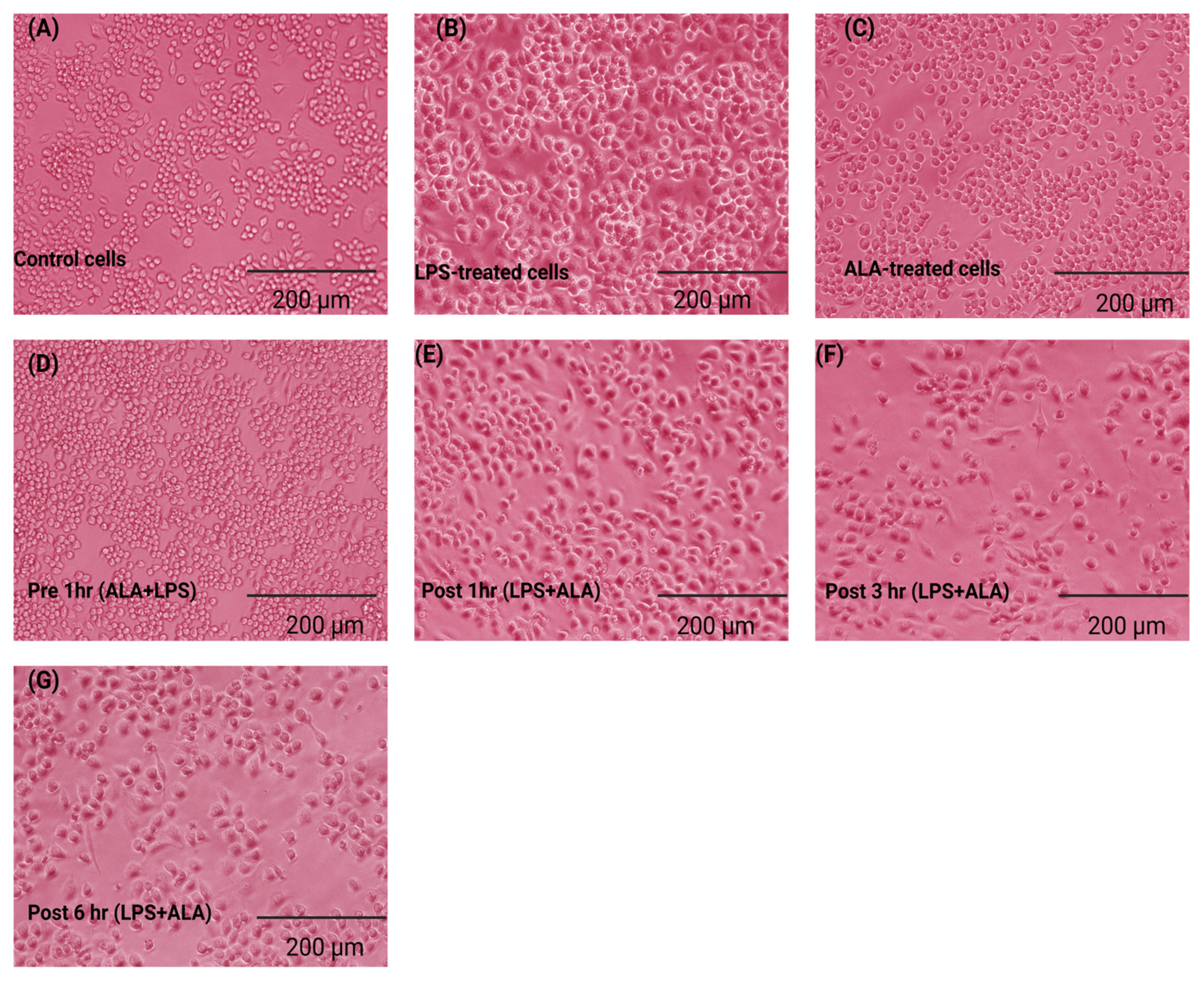 Representative image from one experiment to show protective effects of ALA on the morphology of LPS-stimulated RAW 264.7 macrophages (scale bar = 200 µm). (A) Normal RAW 264.7 macrophages. (B) LPS-stimulated RAW 264.7 macrophages, 100 ng/mL. (C) Treatment of RAW 264.7 macrophages with 1000 μM ALA. (D) ALA pre-treatment at 1 h before LPS stimulation in RAW 264.7 macrophages. (E) ALA post-treatment at 1 h after LPS stimulation in RAW 264.7 macrophages. (F) ALA post-treatment at 3 h after LPS stimulation in RAW 264.7 macrophages. (G) ALA post-treatment at 6 h after LPS stimulation in RAW 264.7 macrophages. A simple ImageJ (1.54p, National Institutes of Health, Bethesda, MD, USA)-based morphometric analysis was performed to support the qualitative analysis of cells. Raw data are provided in Supplementary Excel File S1.