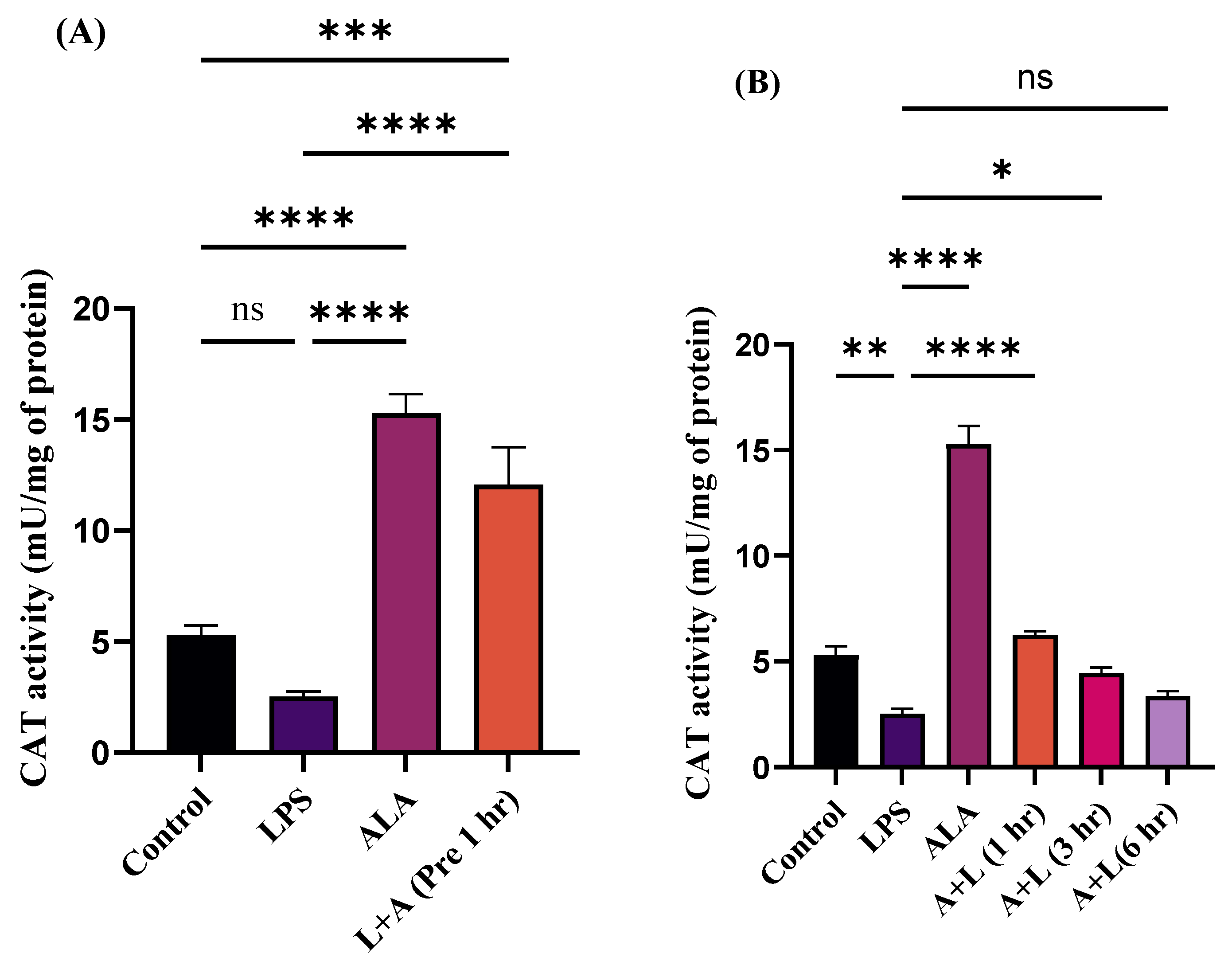 (A,B) Effect of ALA treatment on CAT activity either 1 h before (pre-treatment) or 1, 3, and 6 h post LPS stimulation in RAW 264.7 macrophages. Pre- and post-treatment with ALA in LPS-stimulated RAW 264.7 macrophages increased the CAT activity. Maximum restoration was observed at 1 h ALA pre-treatment. Effects of ALA on CAT activity are strongly time-dependent. Results are expressed in mU/mg of protein and represented as mean ± SEM (n = 3). Each experiment was performed in triplicate on three different days. A one-way ANOVA with a post hoc Tukey test was used. Statistical significance was determined at * p < 0.05; ** p < 0.01; *** p < 0.001; **** p < 0.0001; and non-significant (ns). The quantitative CAT activity data are provided in Supplementary Table S1.